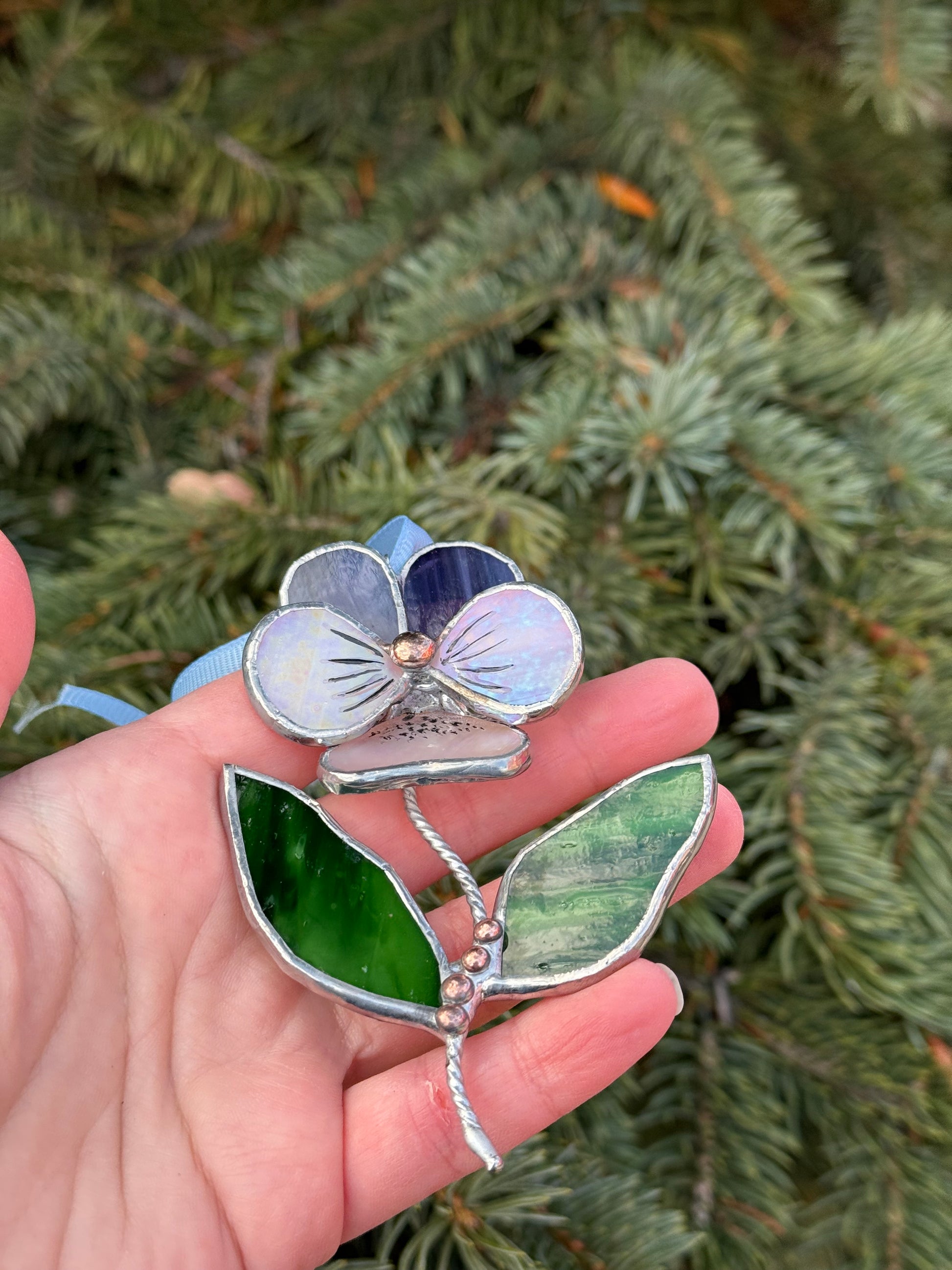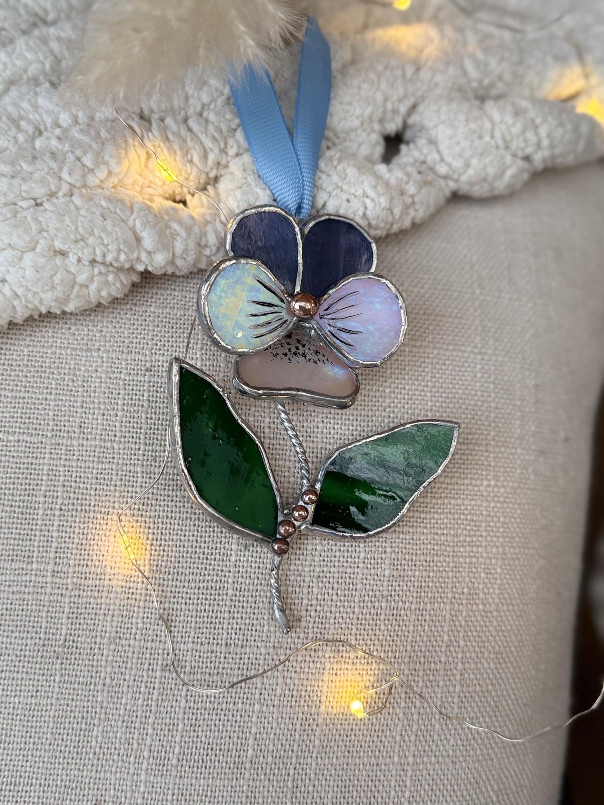 Stained glass ornament Pansy flower with leaves . Ribbon included, ribbon color may vary. Complemented with hand painted acrylic pattern