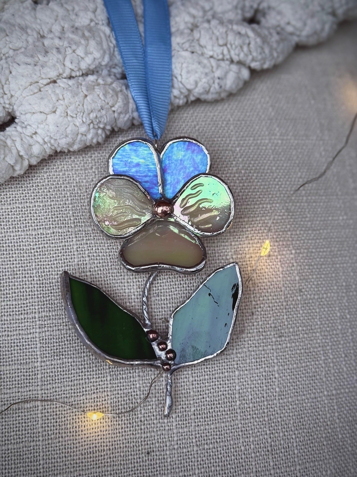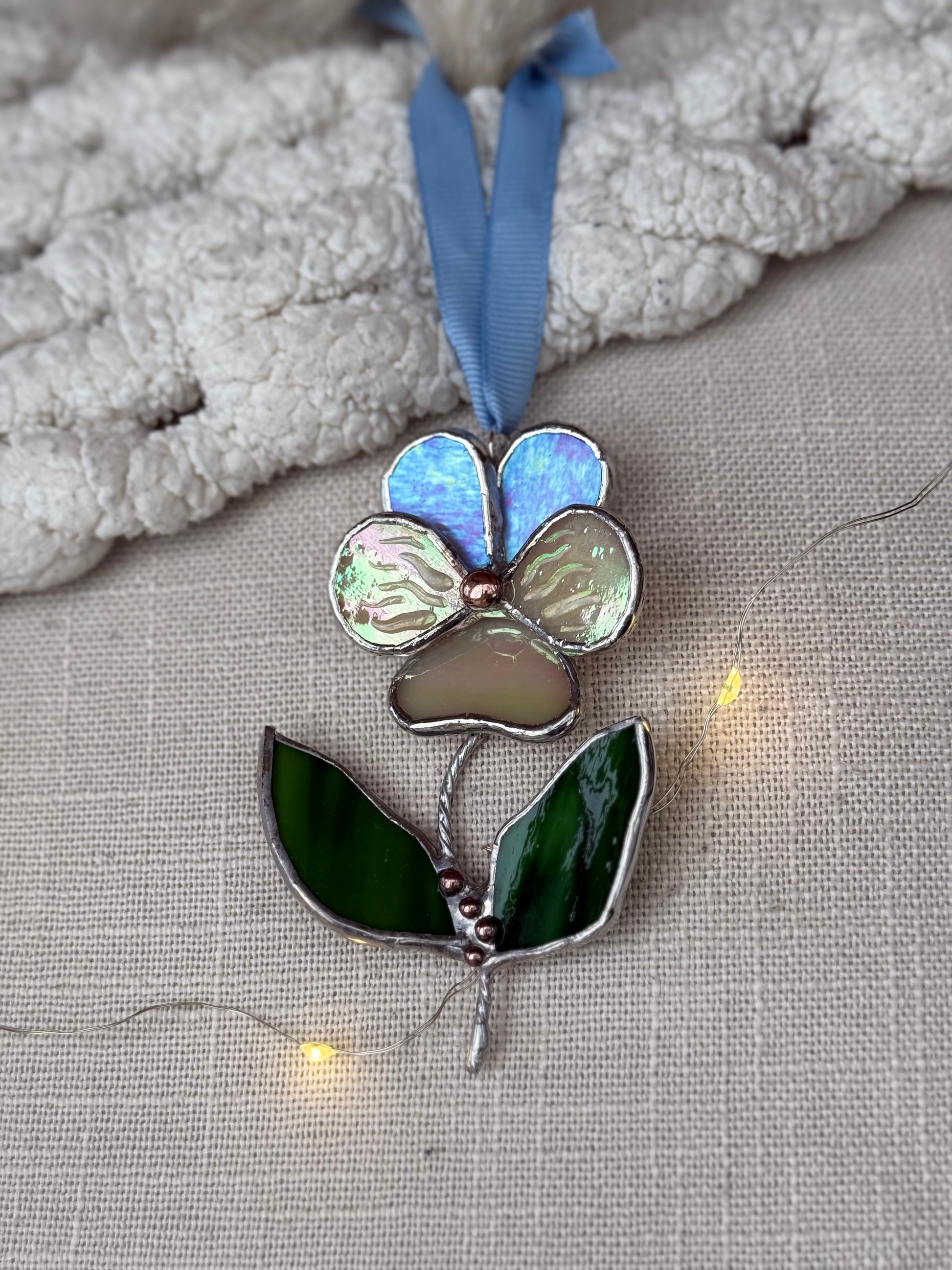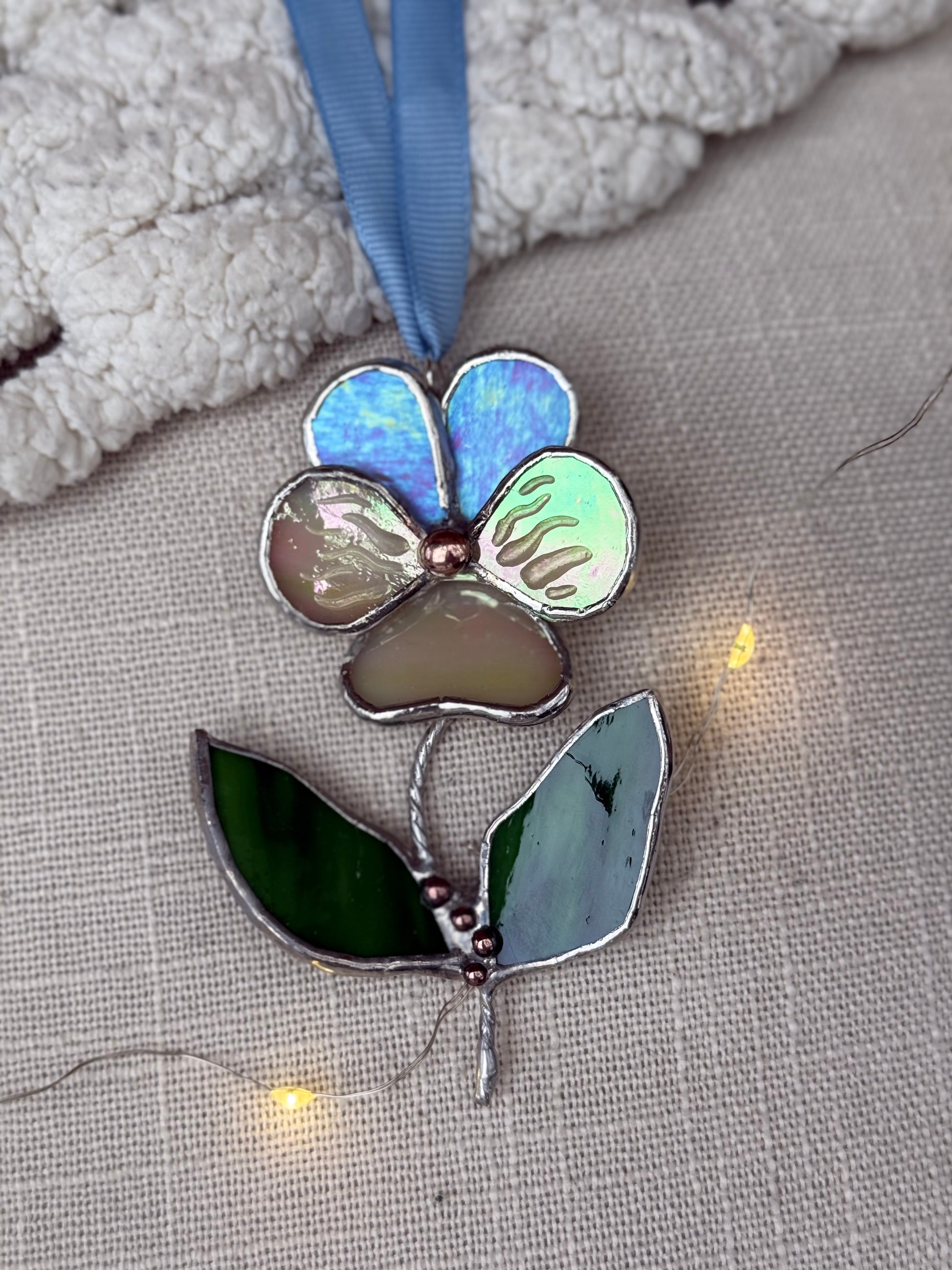 Stained glass ornament Pansy flower with leaves . Ribbon included, ribbon color may vary. Complemented with hand painted acrylic pattern