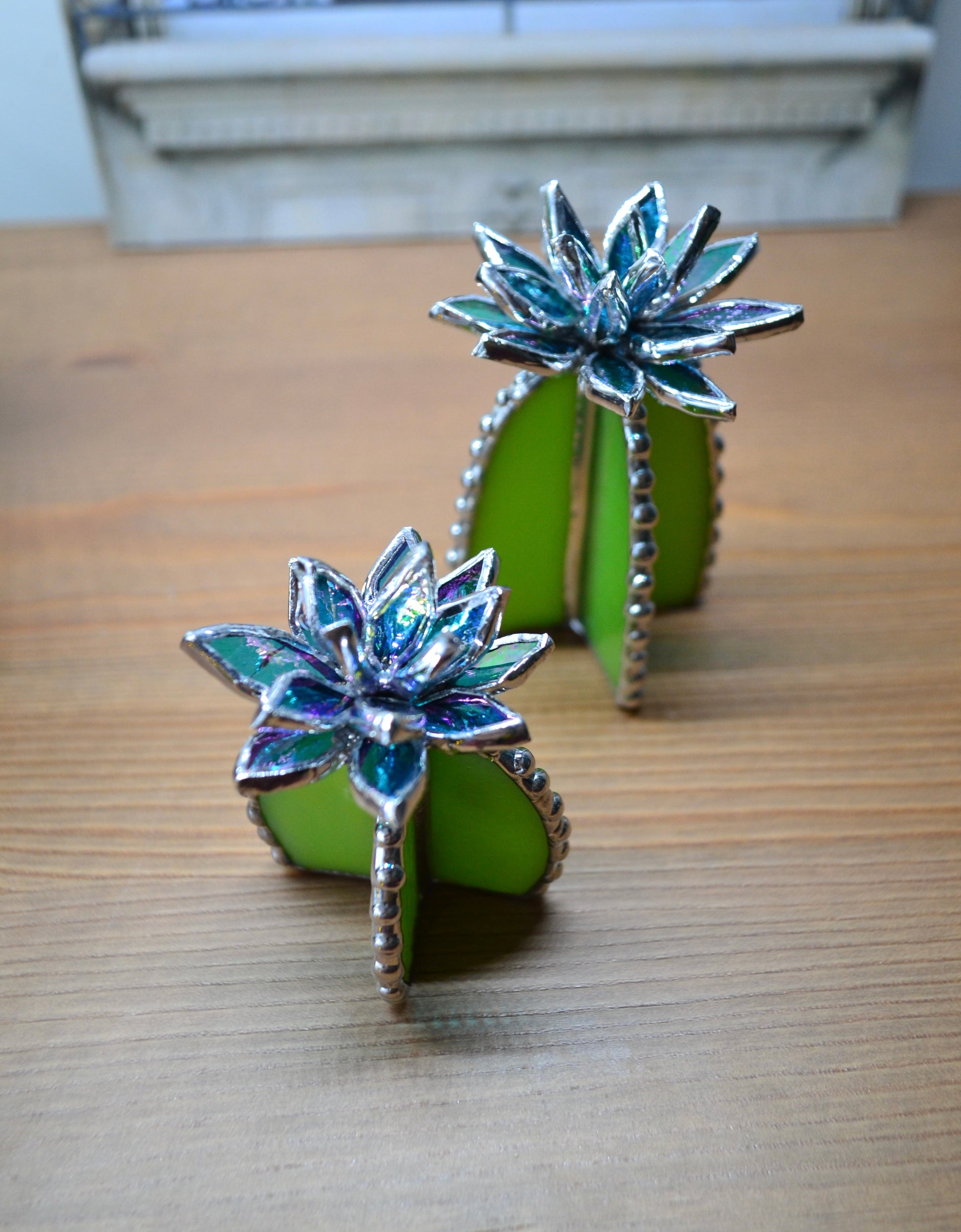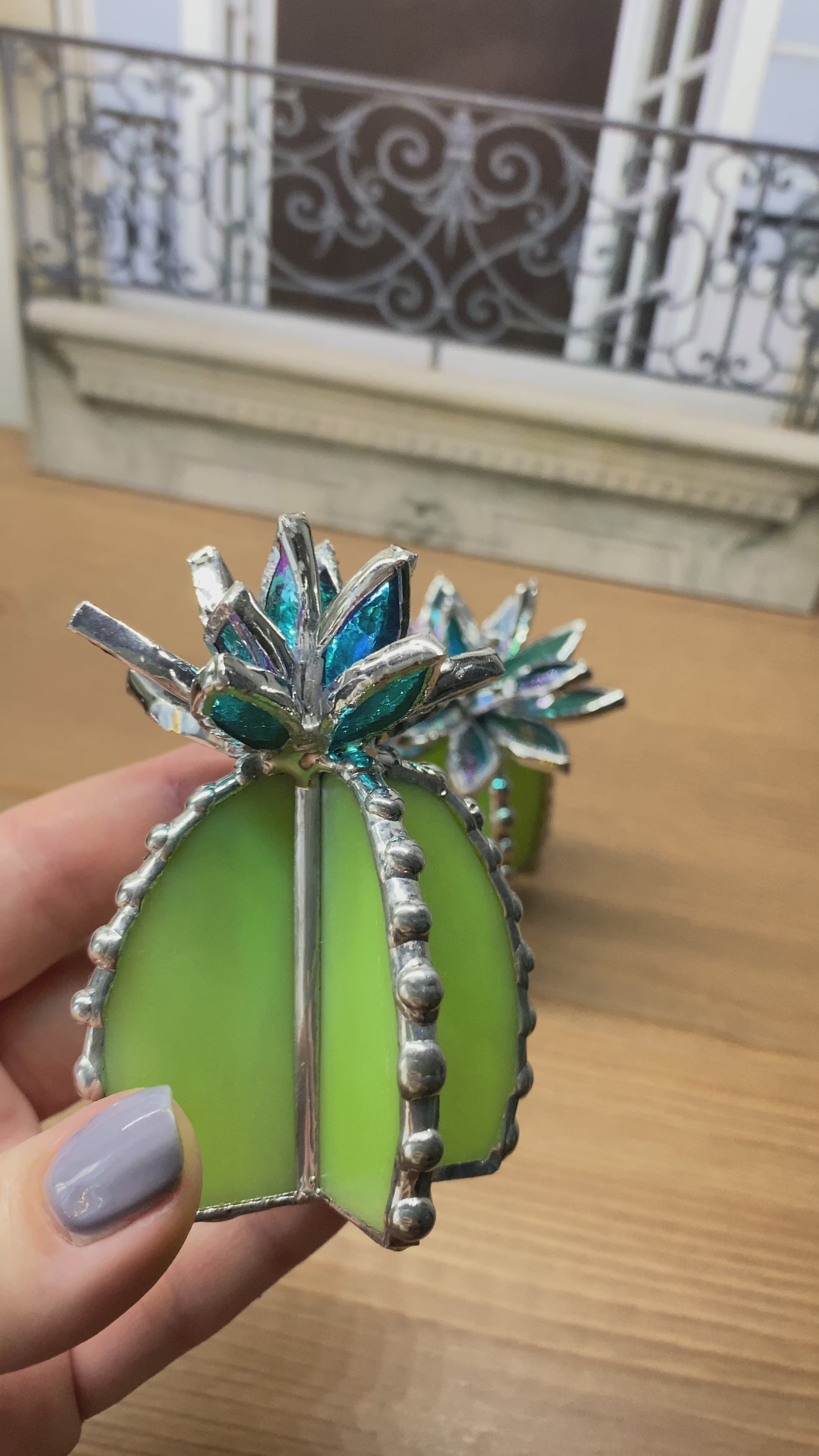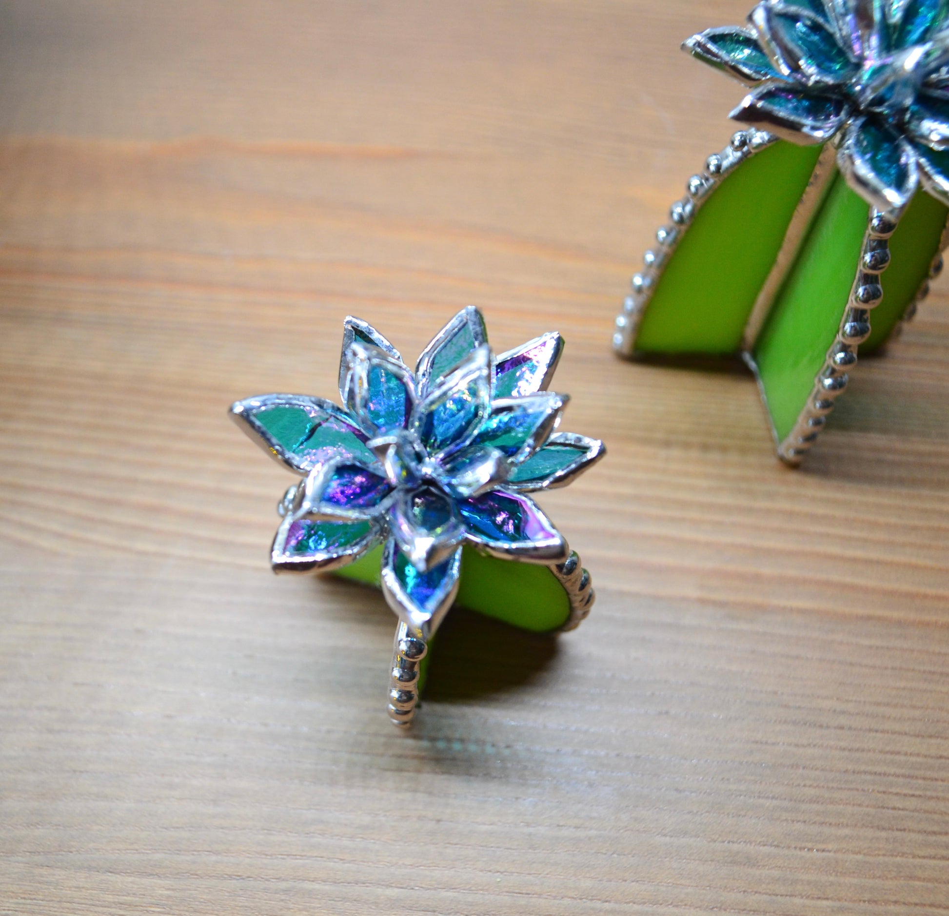 "Cactus M L Iridescent Blue " Stained glass, Succulent 3D design, Valentine’s gift, house plant for flower pot, Sun catcher