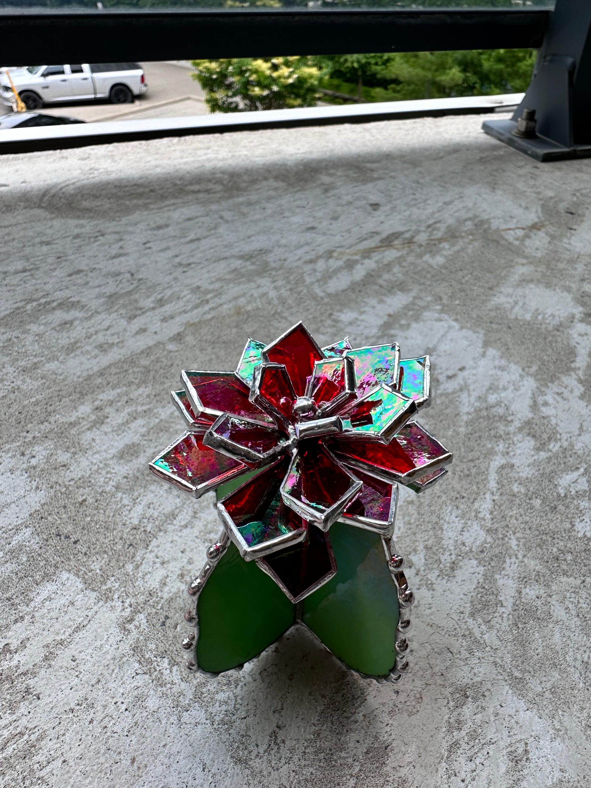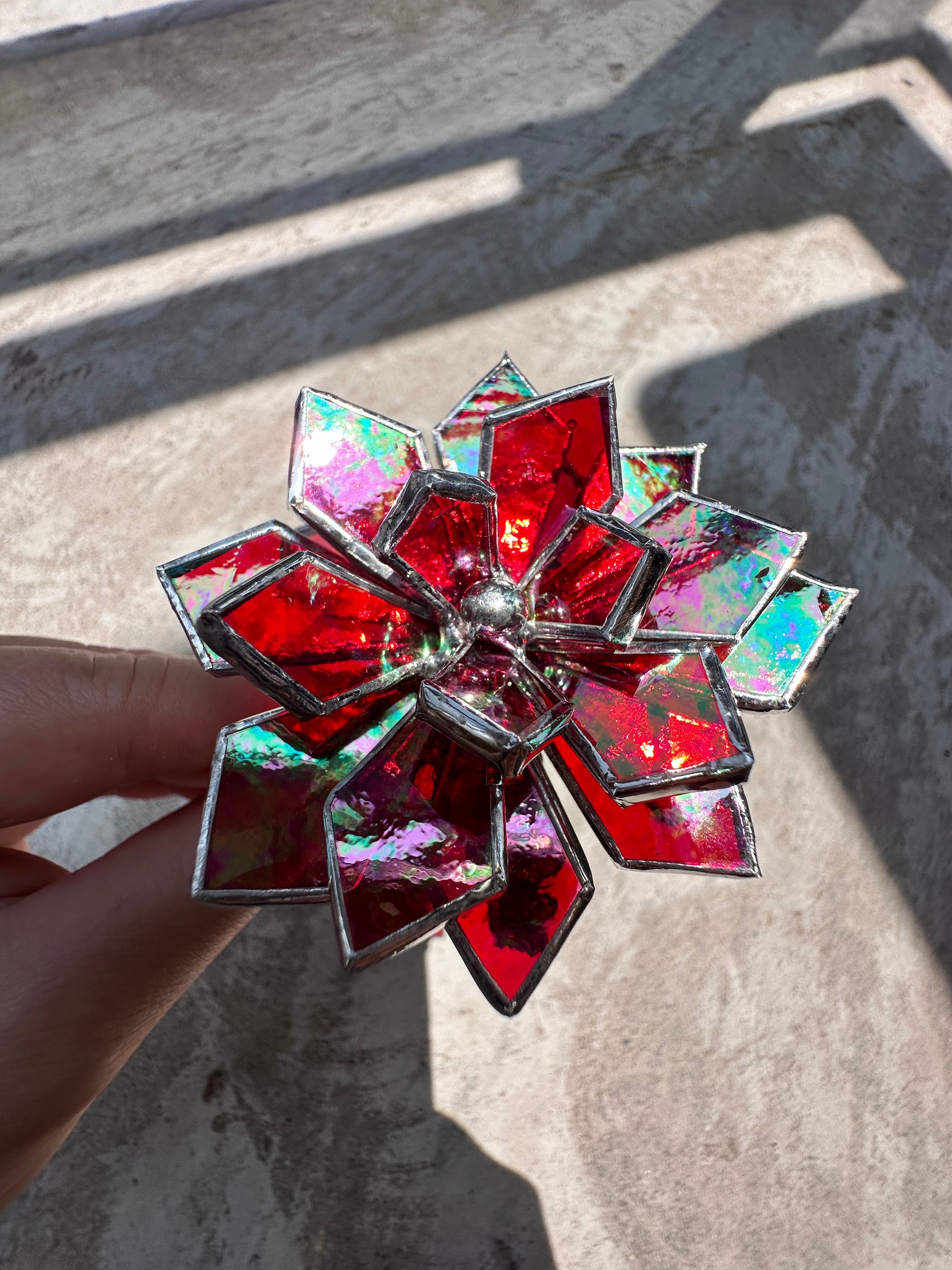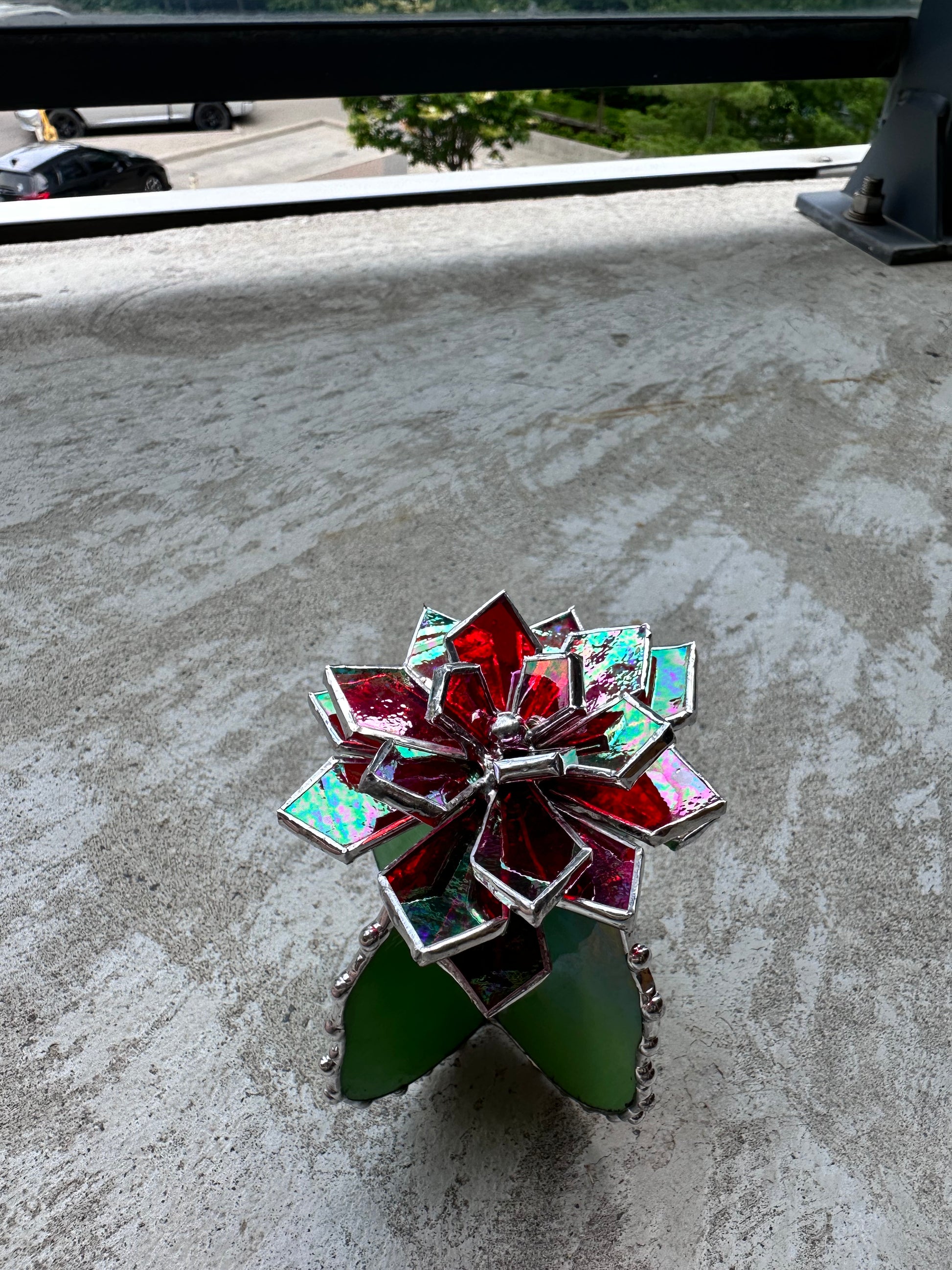 "Cactus XL blooming Red Iridescent" Stained Glass, Succulent 3D, Echeveria, everlasting plant for flower pot