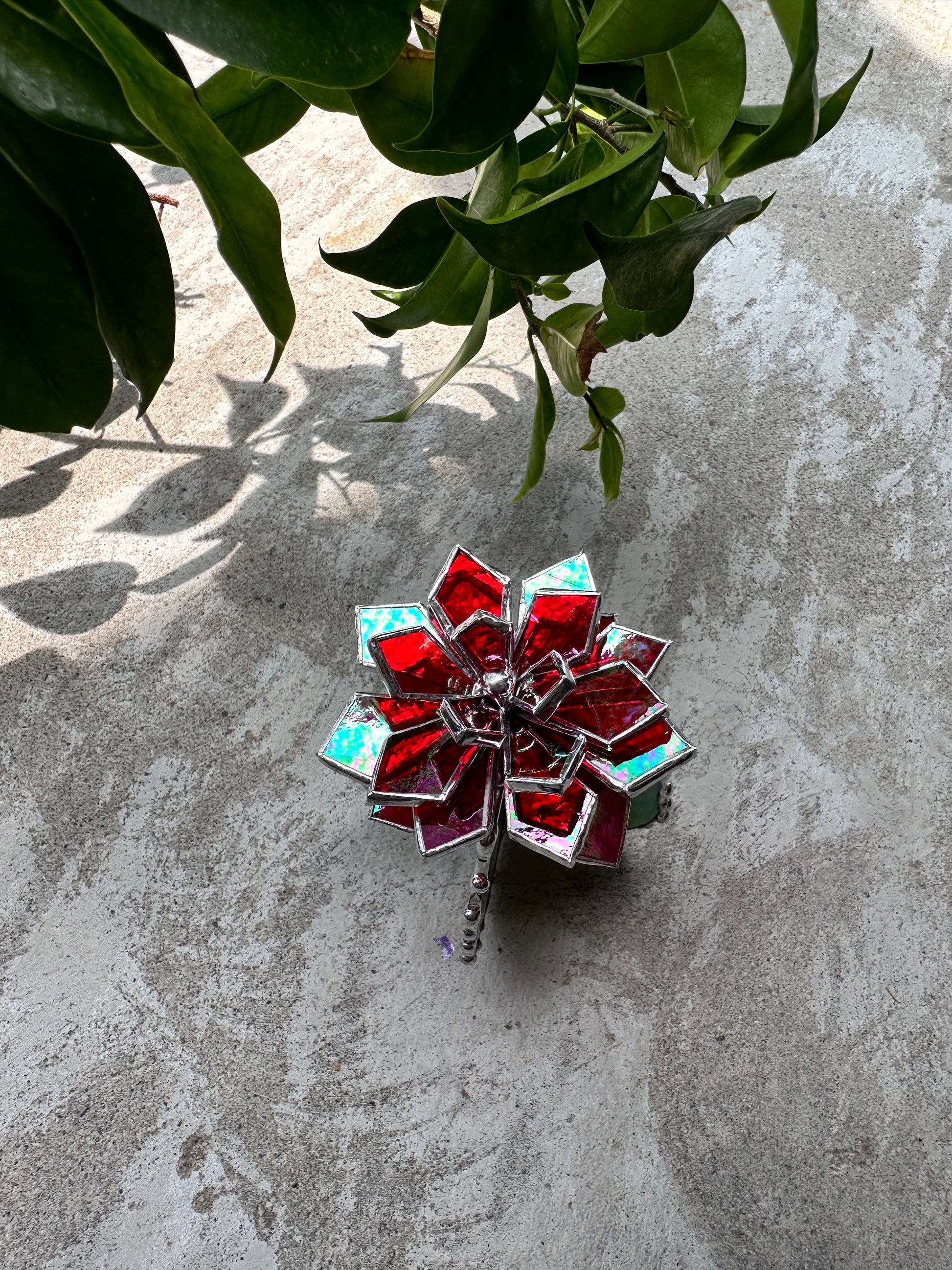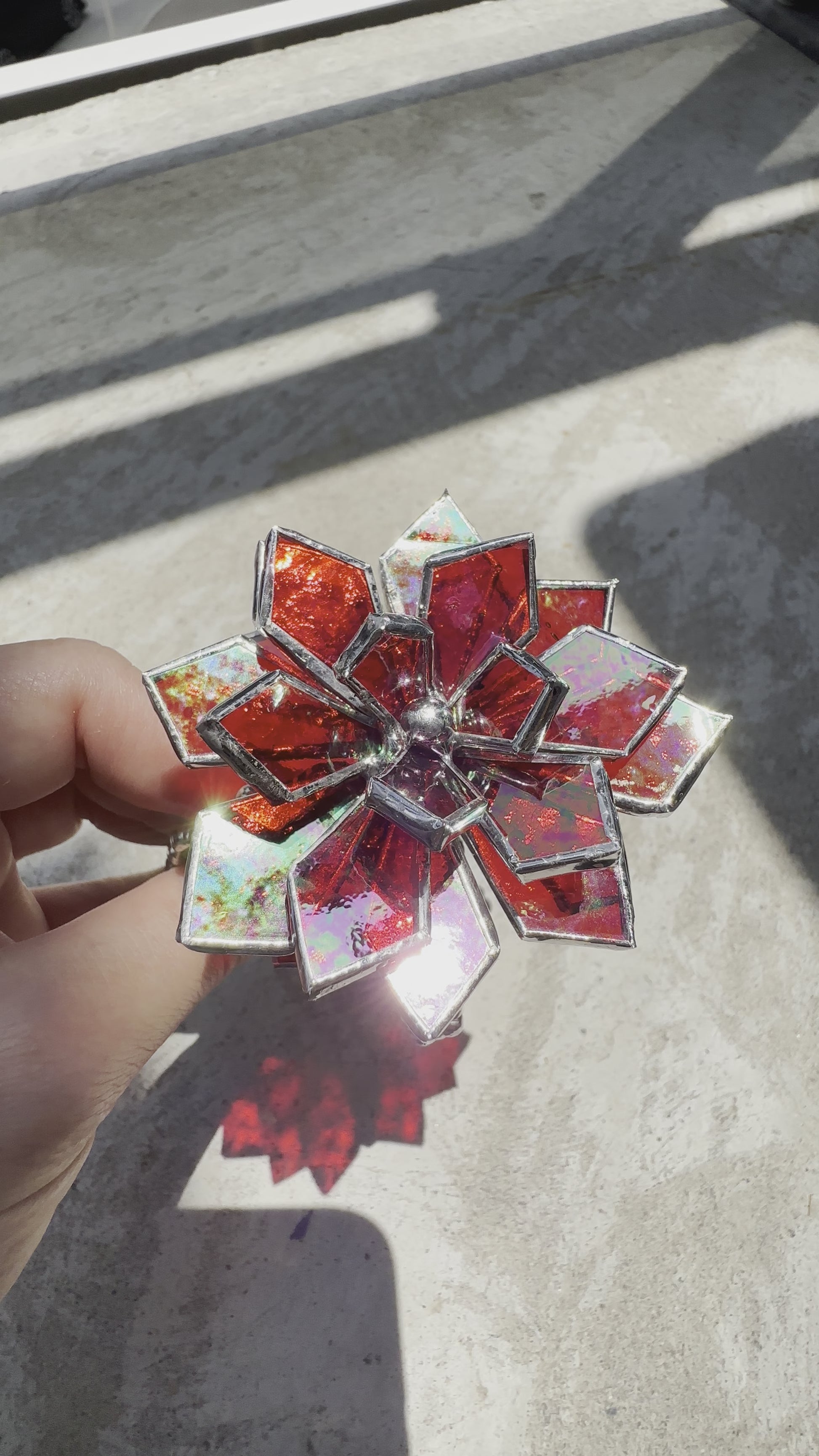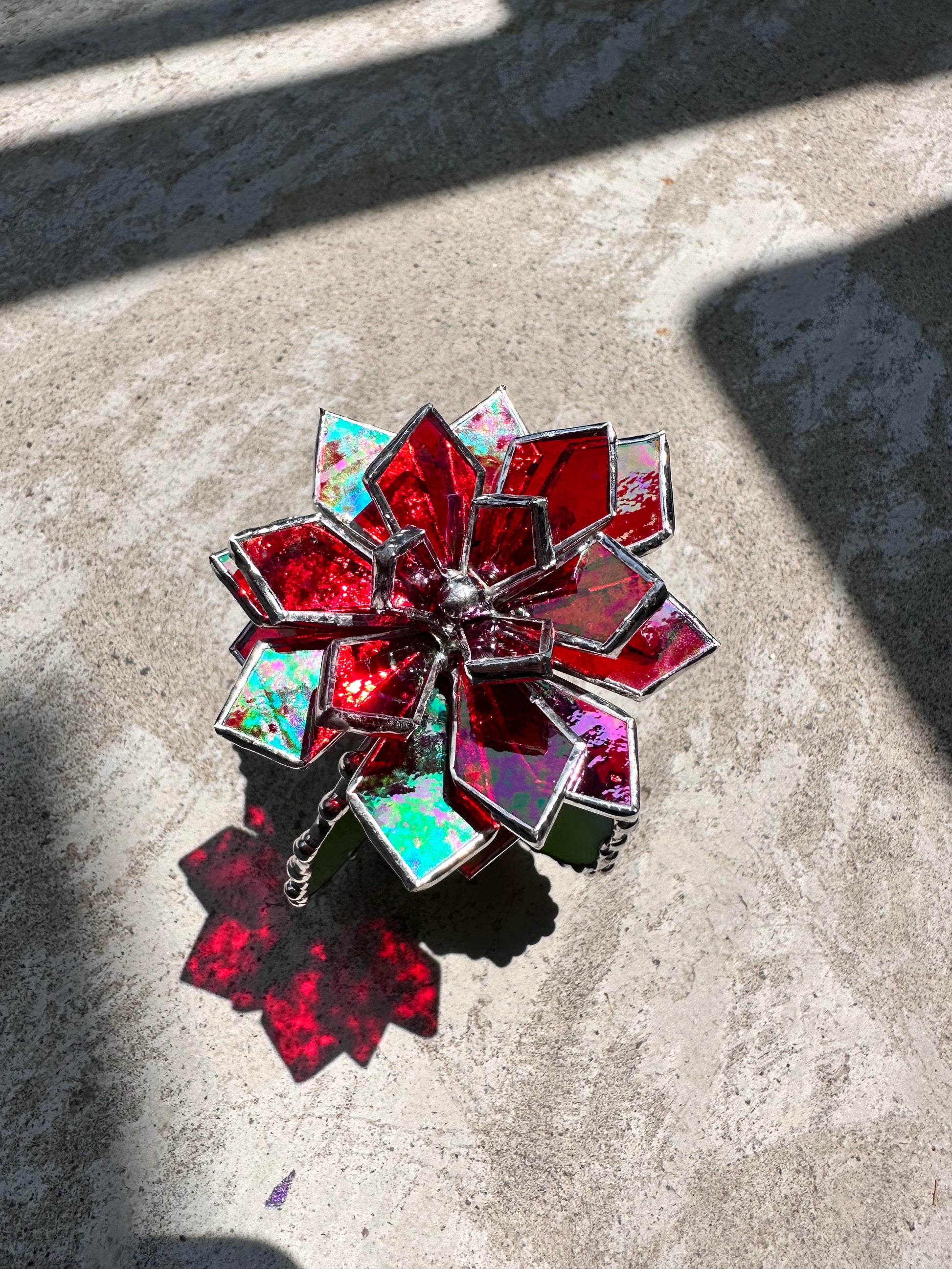 "Cactus XL blooming Red Iridescent" Stained Glass, Succulent 3D, Echeveria, everlasting plant for flower pot