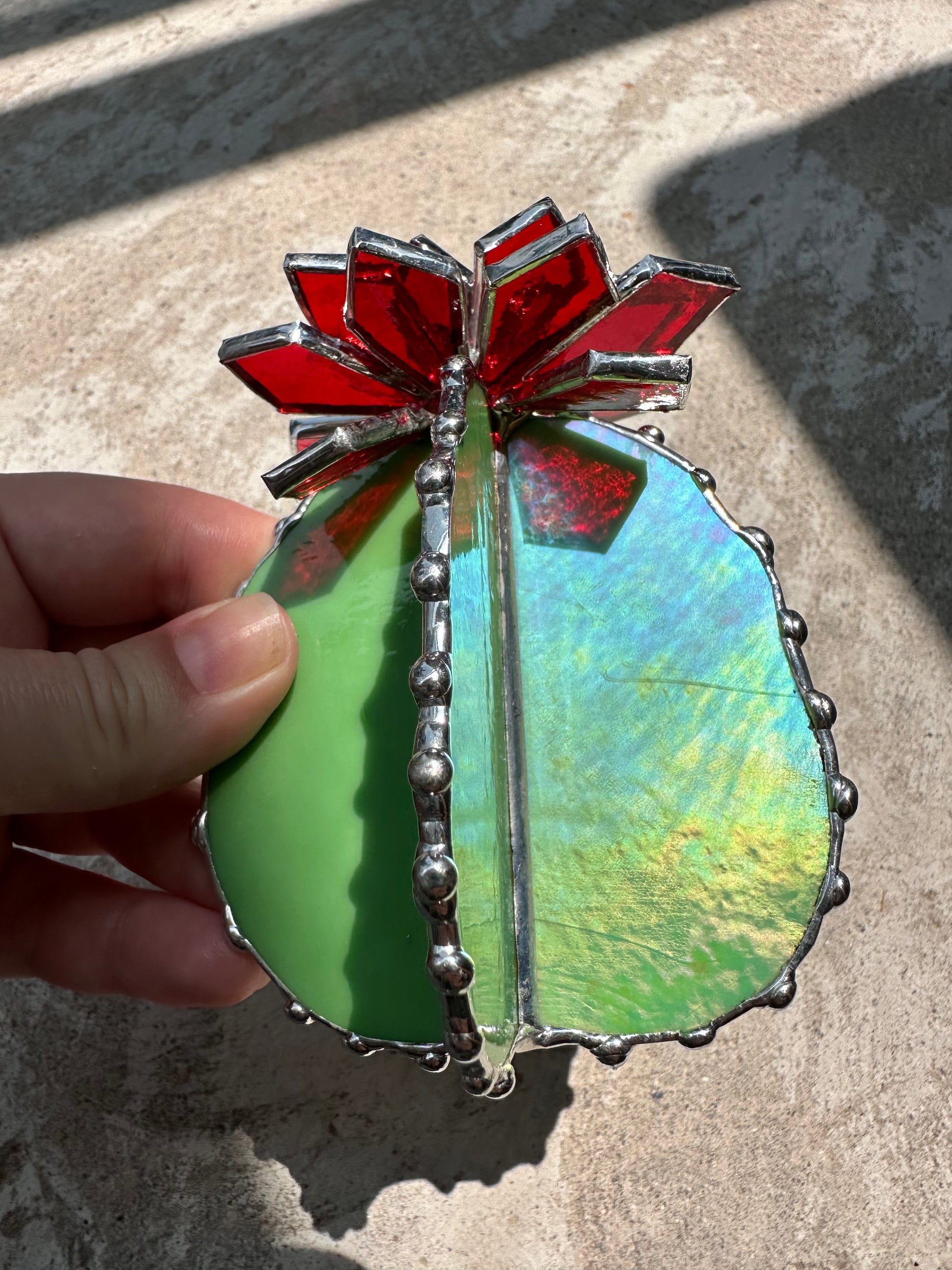 Vibrant stained glass Cactus Red Iridescent made of colourful art glass soldered using copper foil and tin with Tiffany technique.