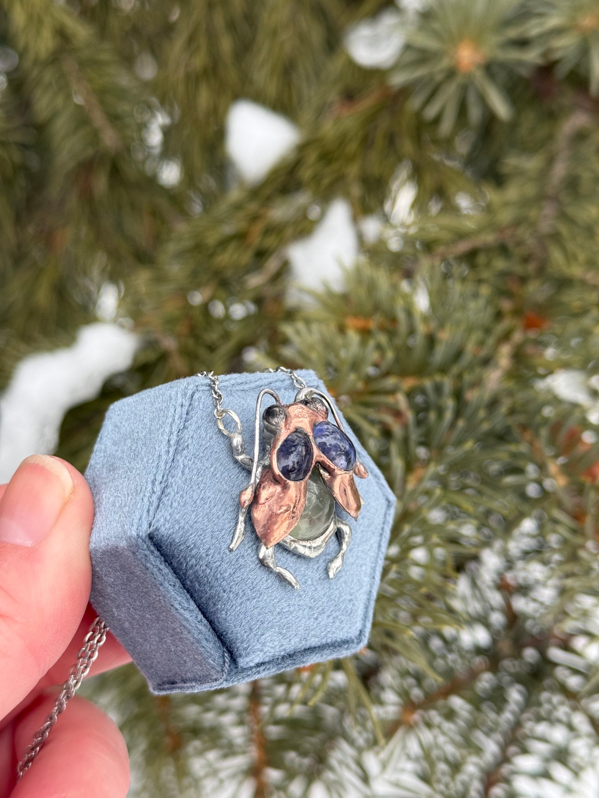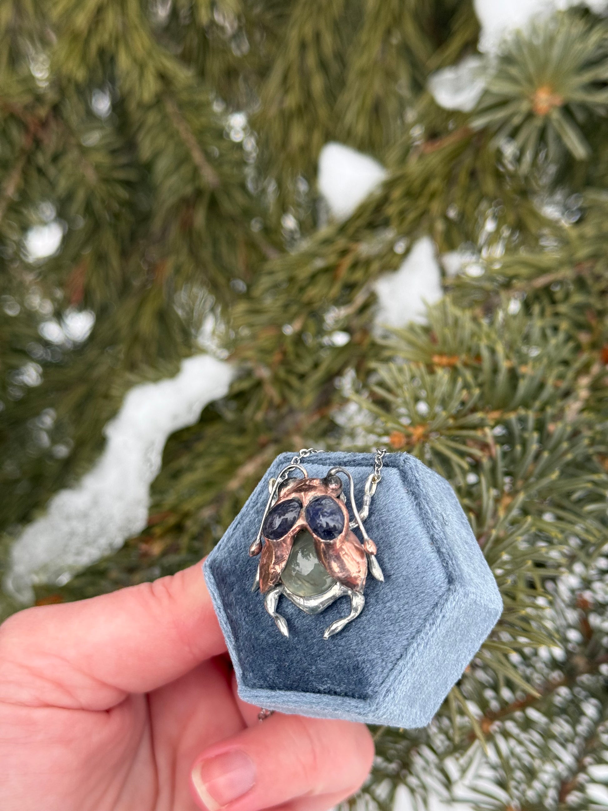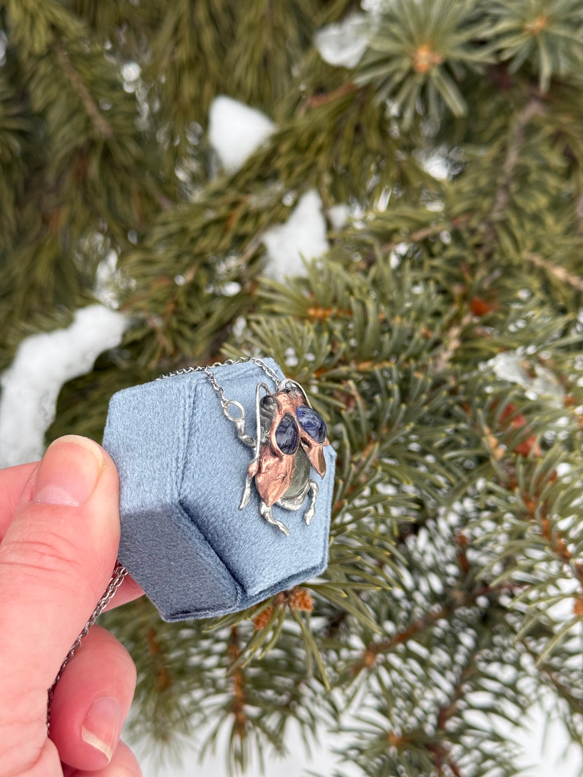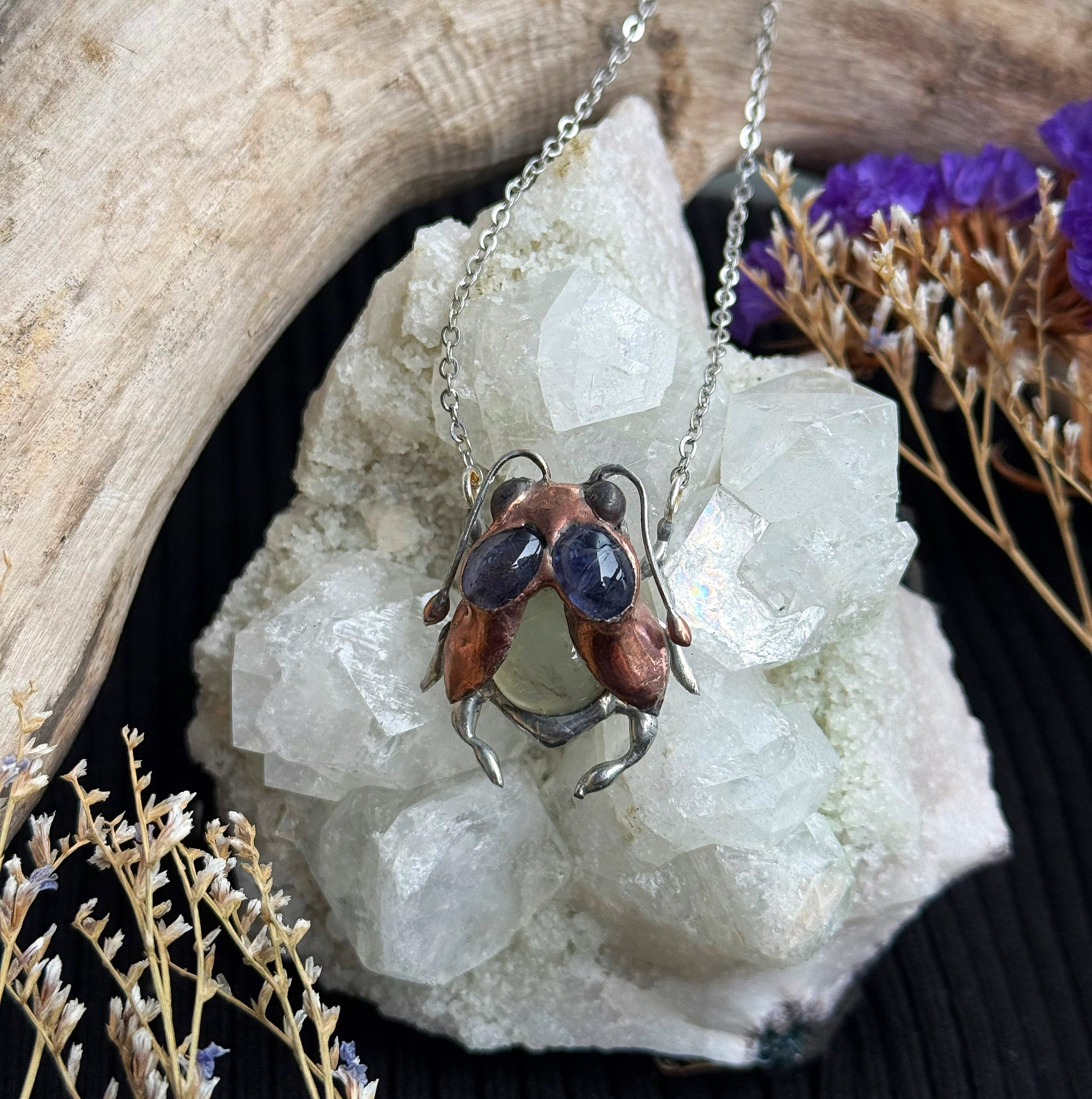 " . Bug necklace Baby Cicada with Blue Iolite & Olive Prehnite”, art jewelry pendant 3D wedding jewelry Mother’s Day gift sale