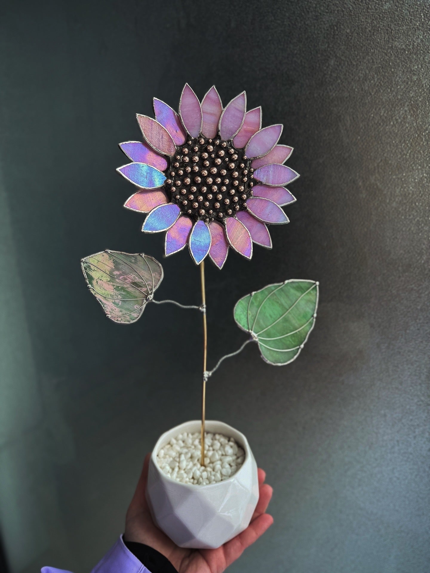 This unique hand crafted with stained glass 3D Sunflower made of art glass. Completed with ceramic pot (removable). The original design.