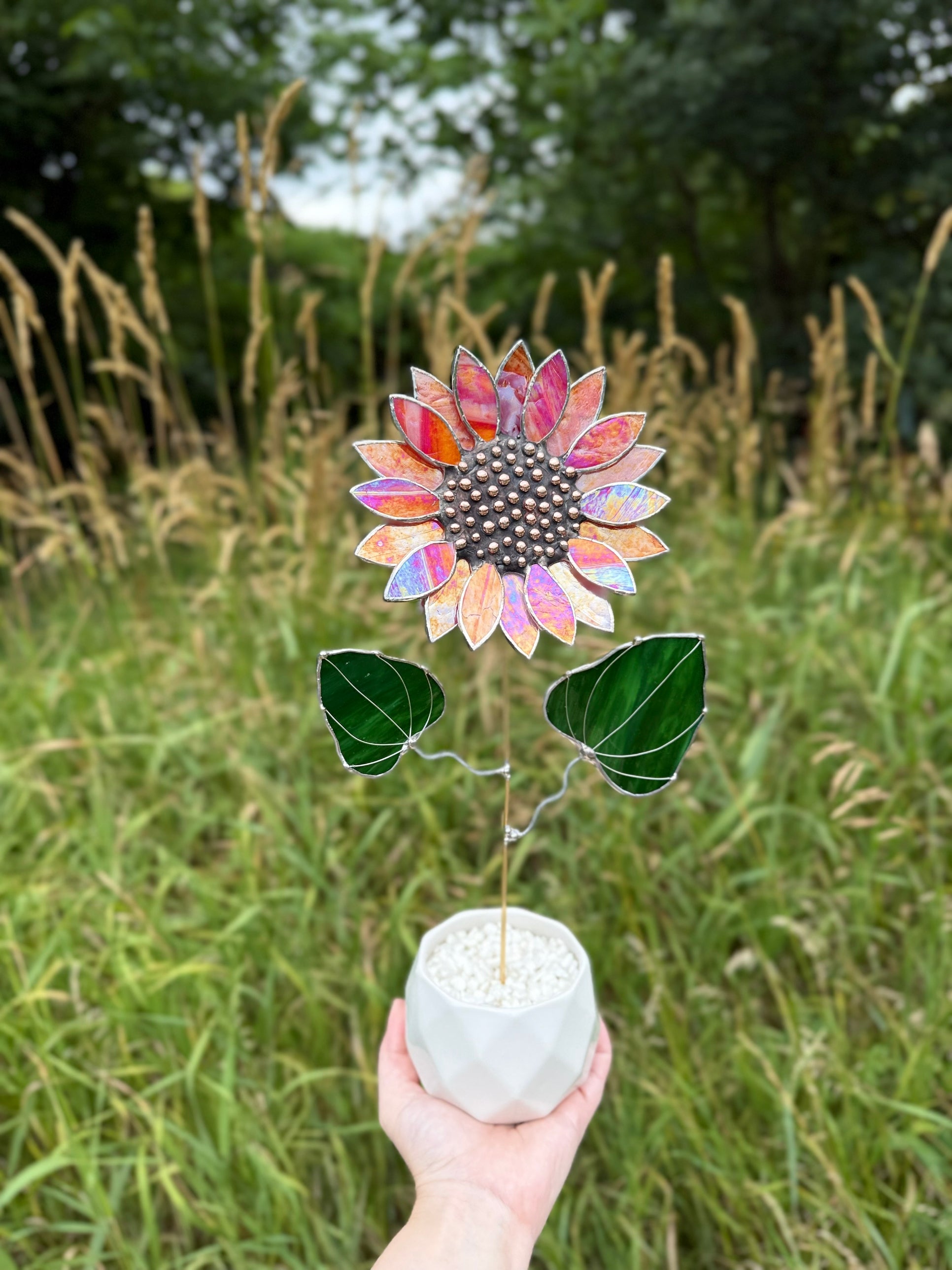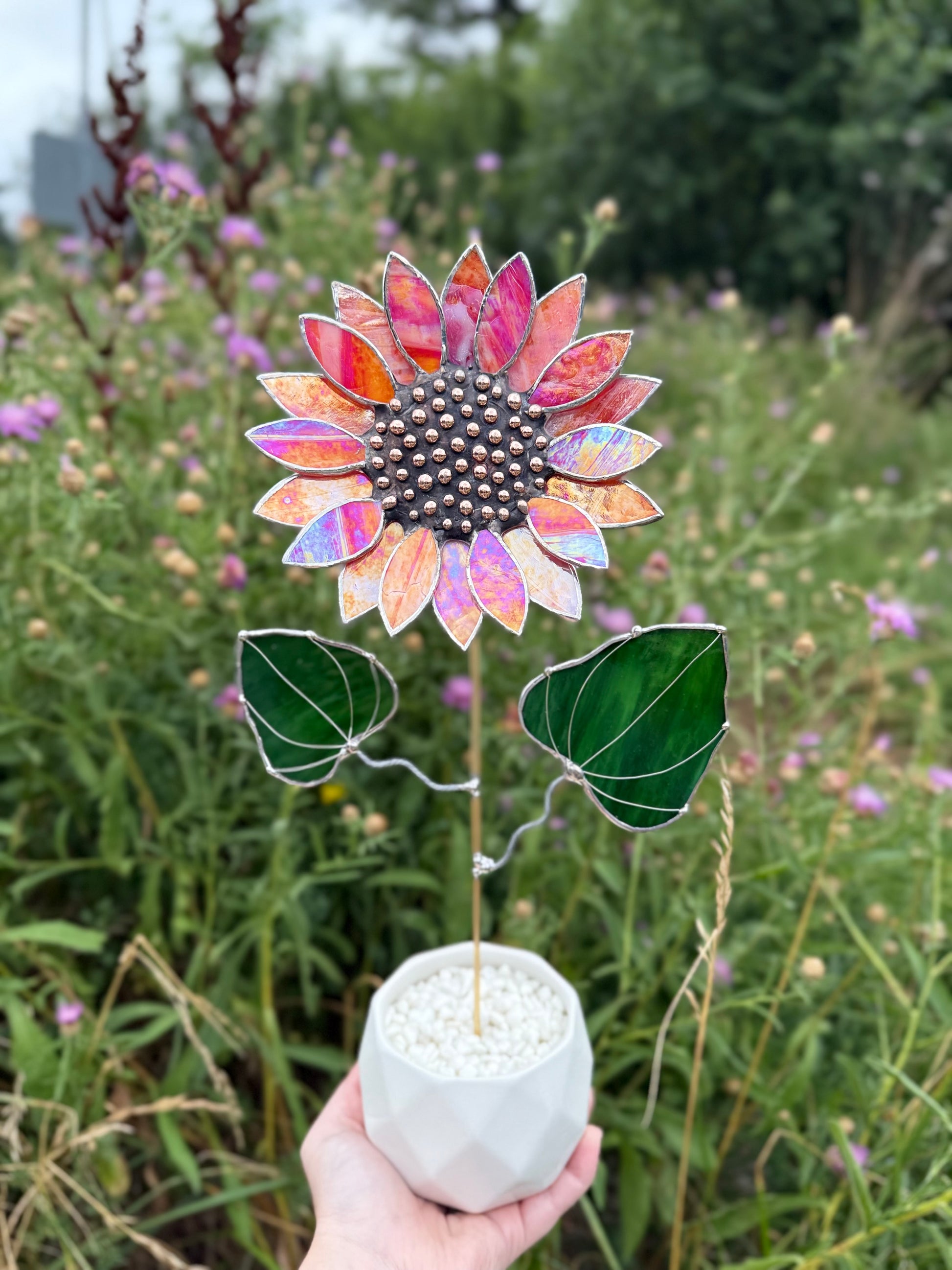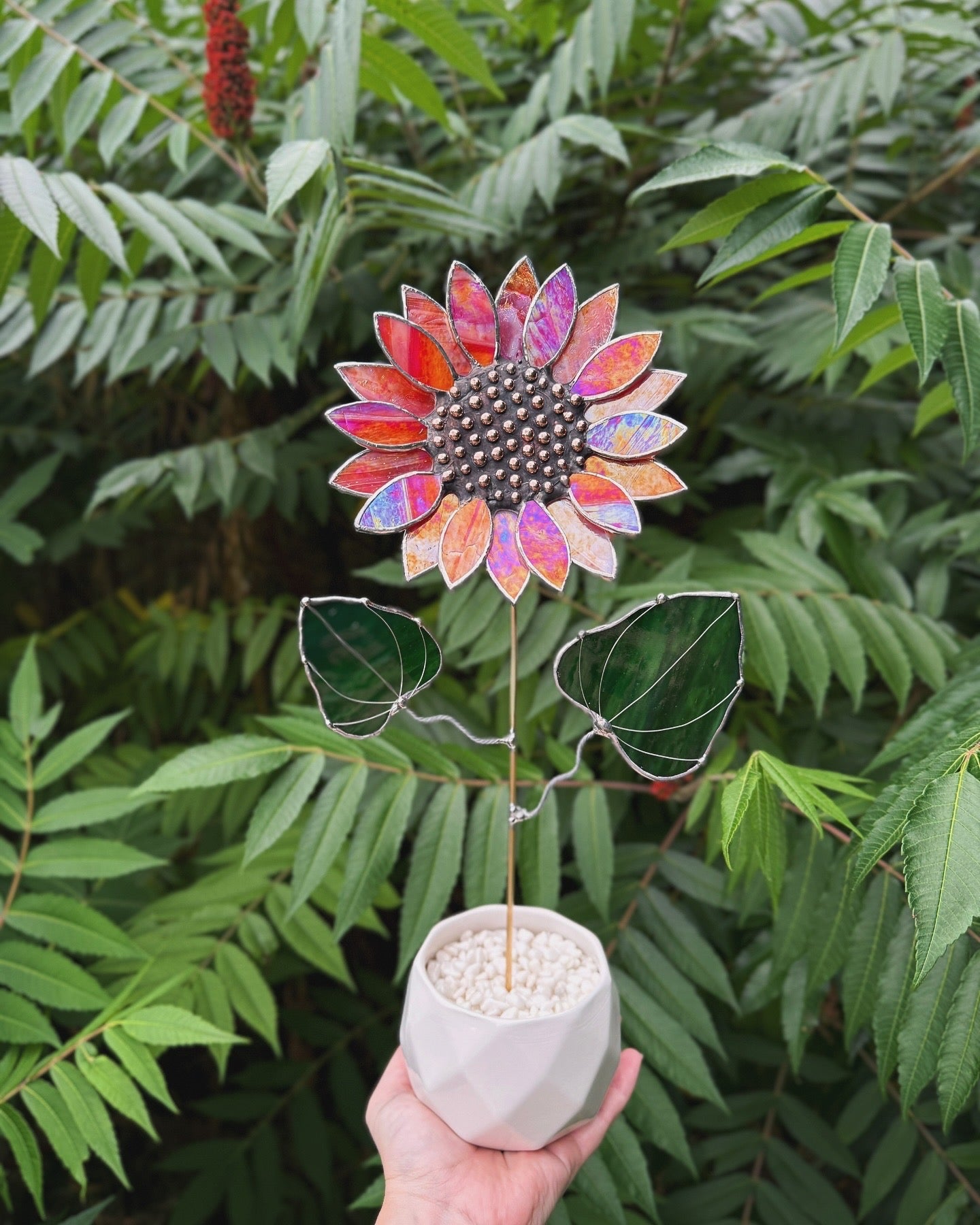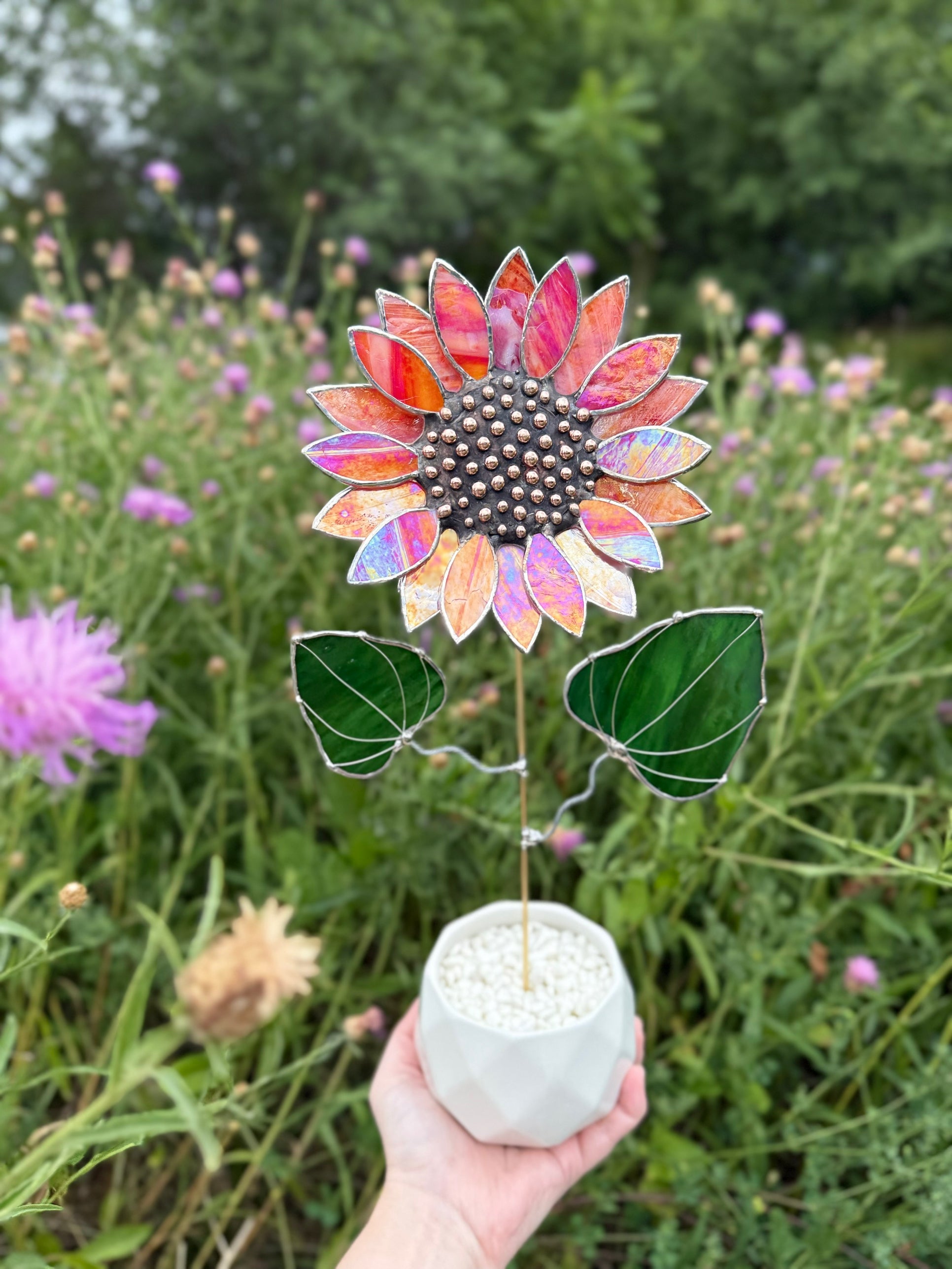 This unique hand crafted with stained glass 3D Sunflower made of art glass. Completed with ceramic pot (removable). The original design.