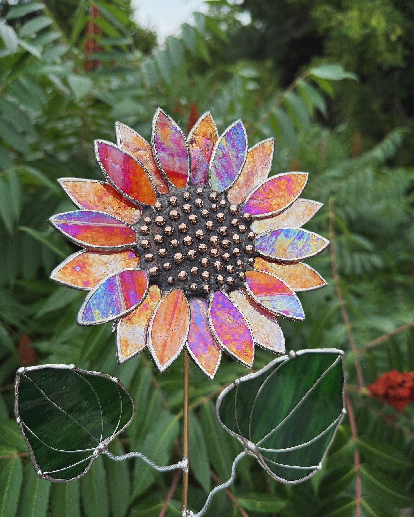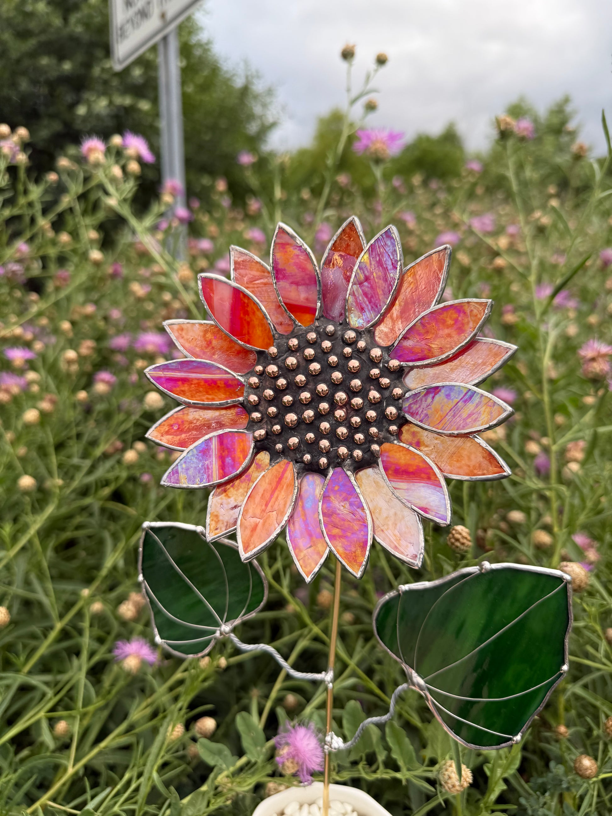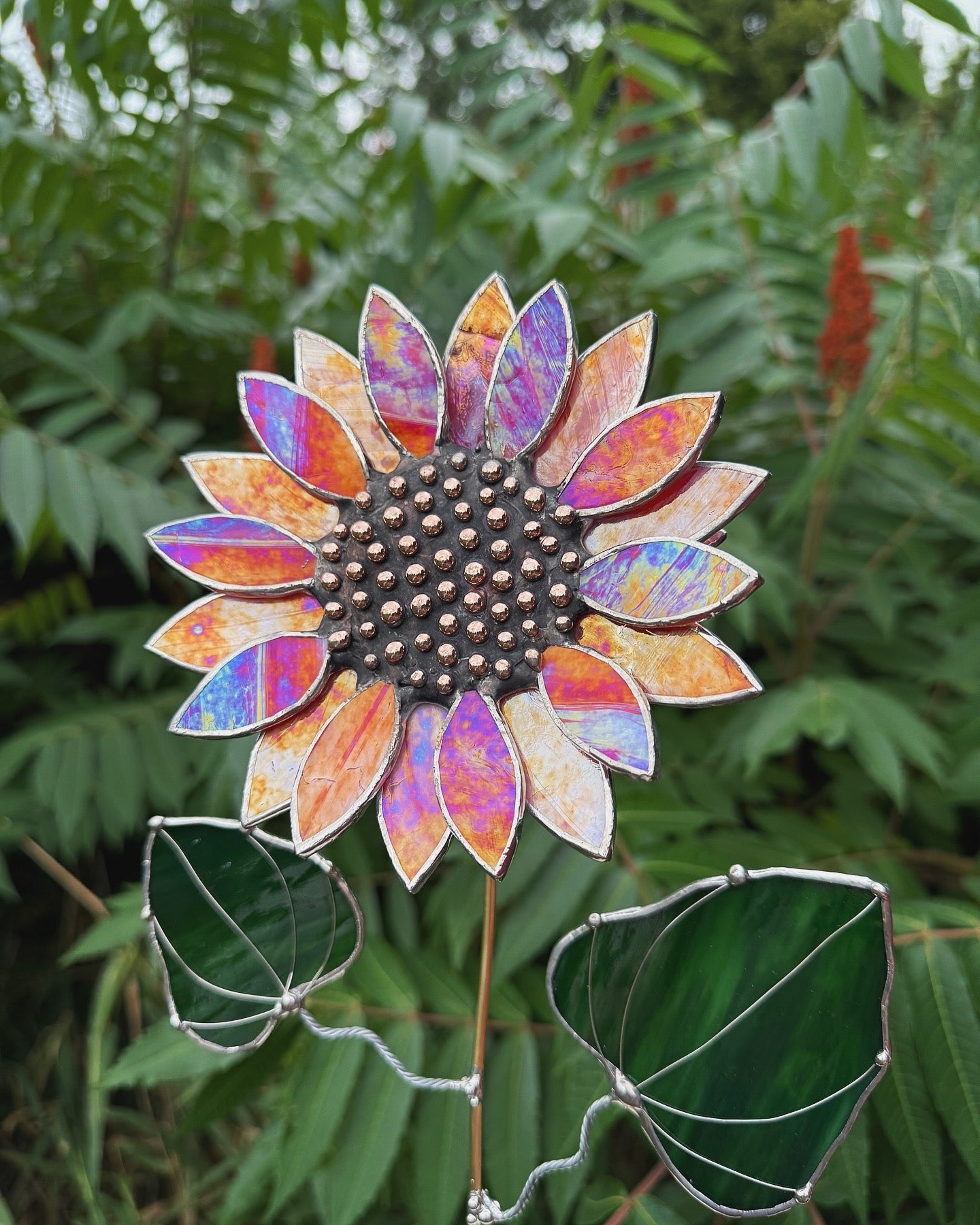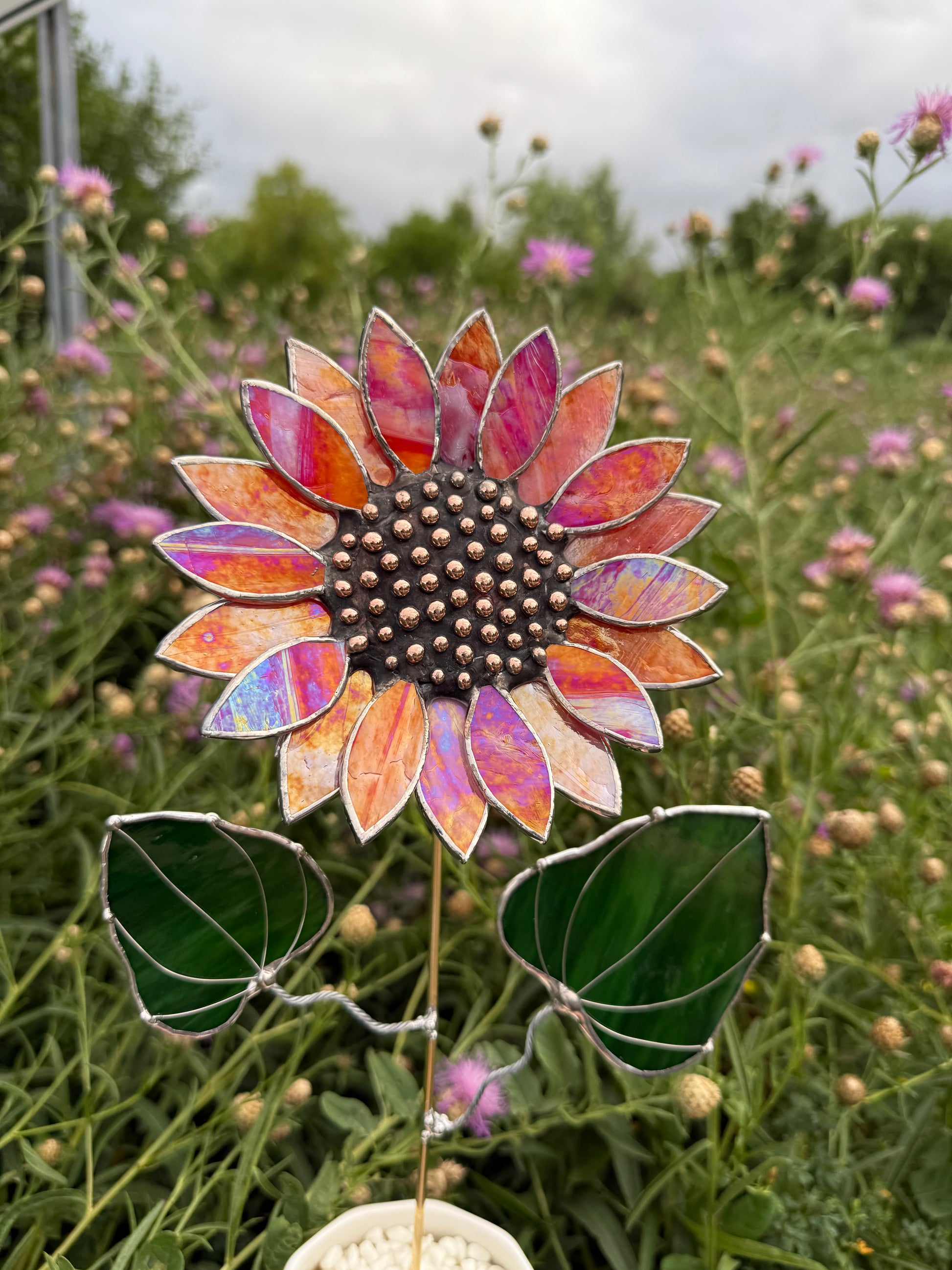 " . Sunflower Red Amber iridescent", stained glass tropical flower 3D, Sun catcher, Table plant decor, Garden stake, Outdoor and gardening, wedding Christmas gift sale