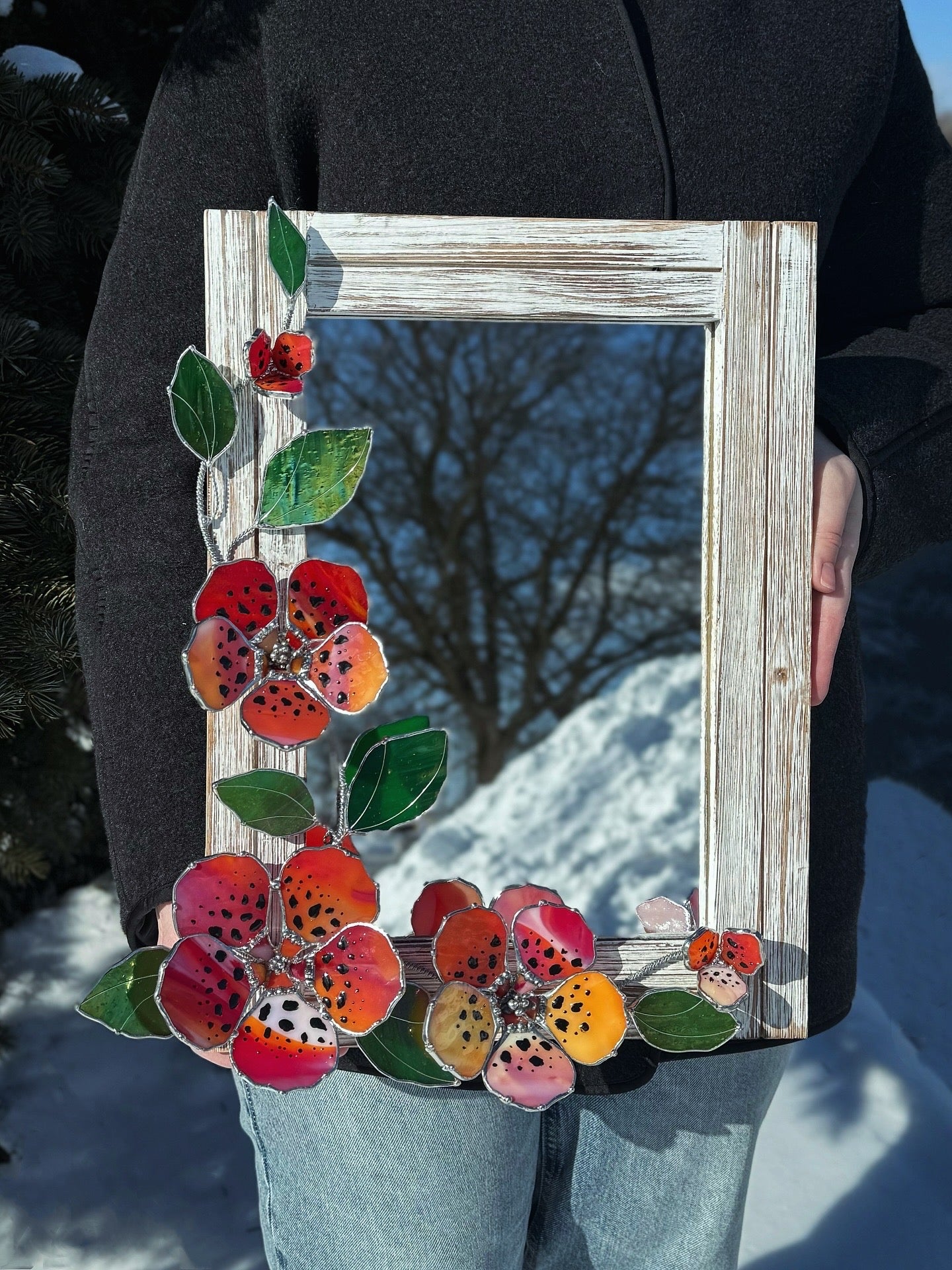 This stained glass hibiscus wall mirror transforms a functional object into a dimensional work of art. 3D hibiscus blooms and glass foliage frame the mirror with rich tones of crimson, coral, amber, and fresh green, creating a dynamic composition full of depth and light.