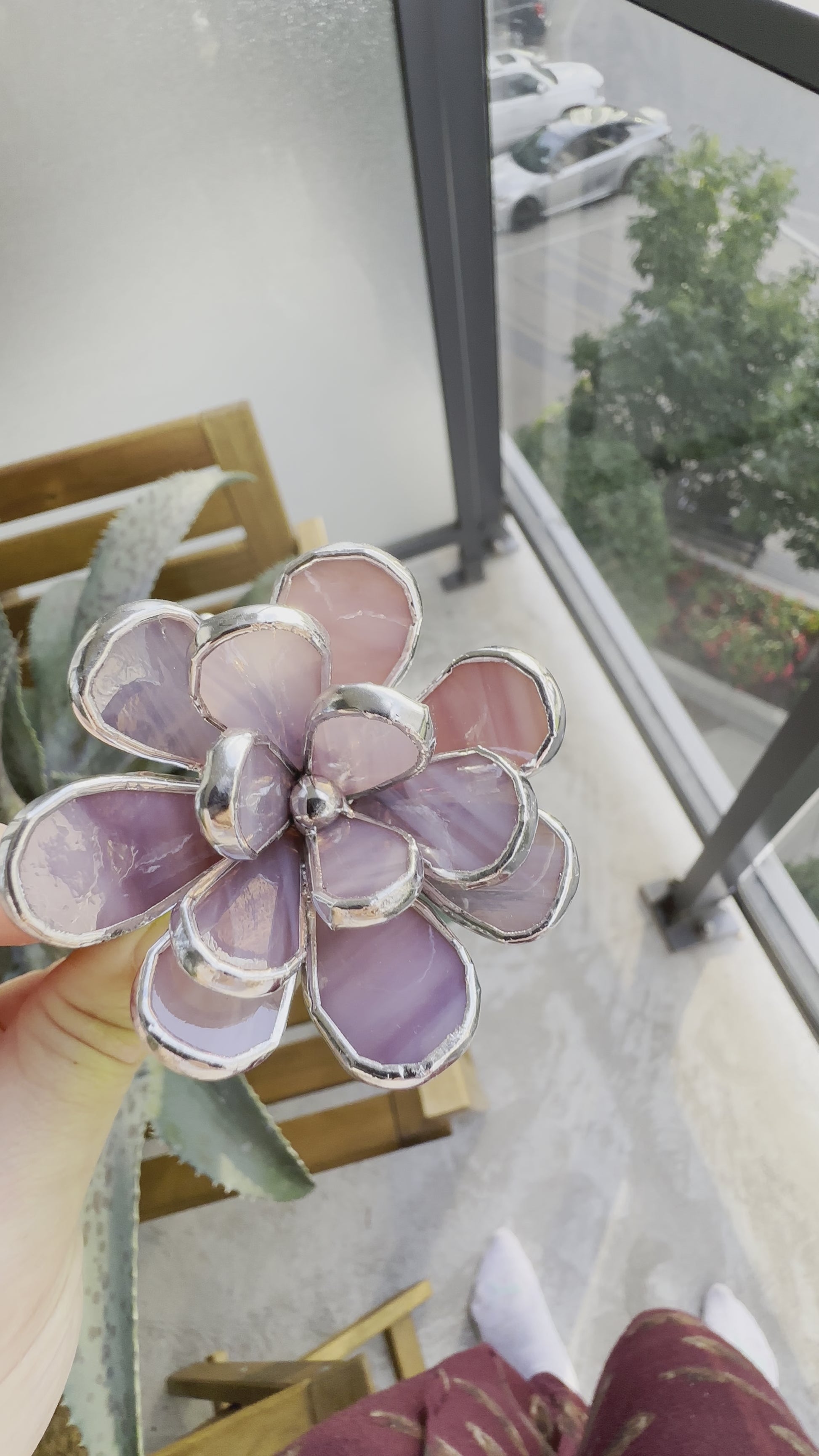 Absolutely gorgeous stained glass Cactus Purple Green translucent made of colourful art glass soldered using copper foil and tin with Tiffany technique.