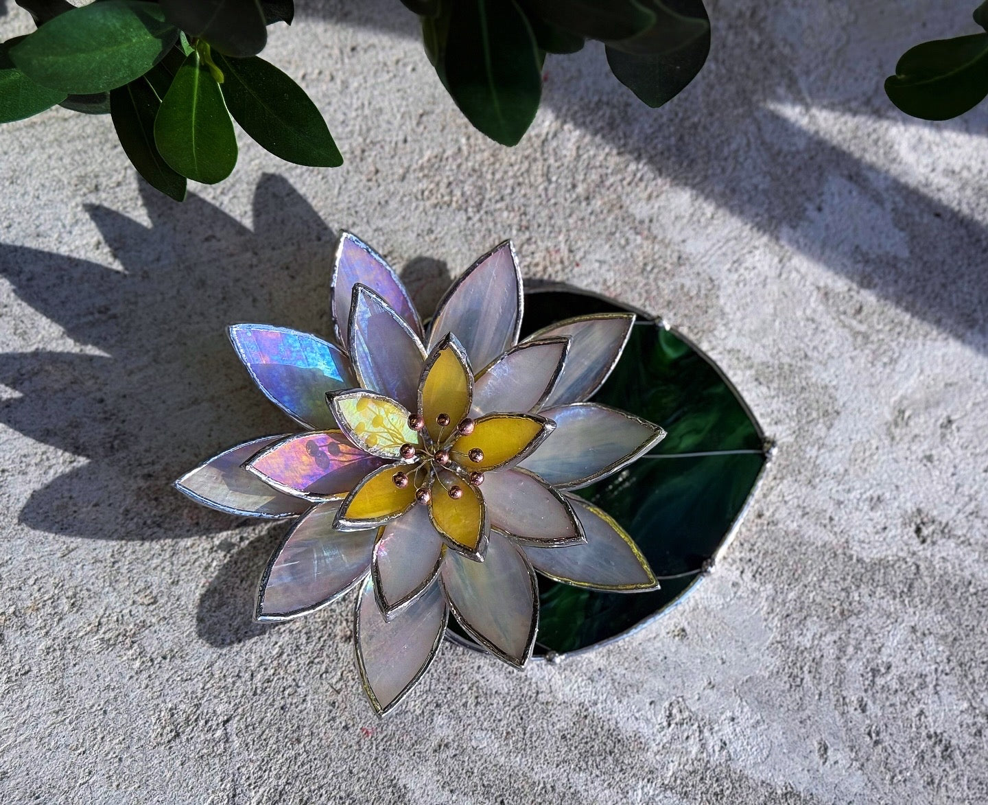 " . Delicate White Water Lily with leaf" Stained glass table decor, holiday decorations, succulents
