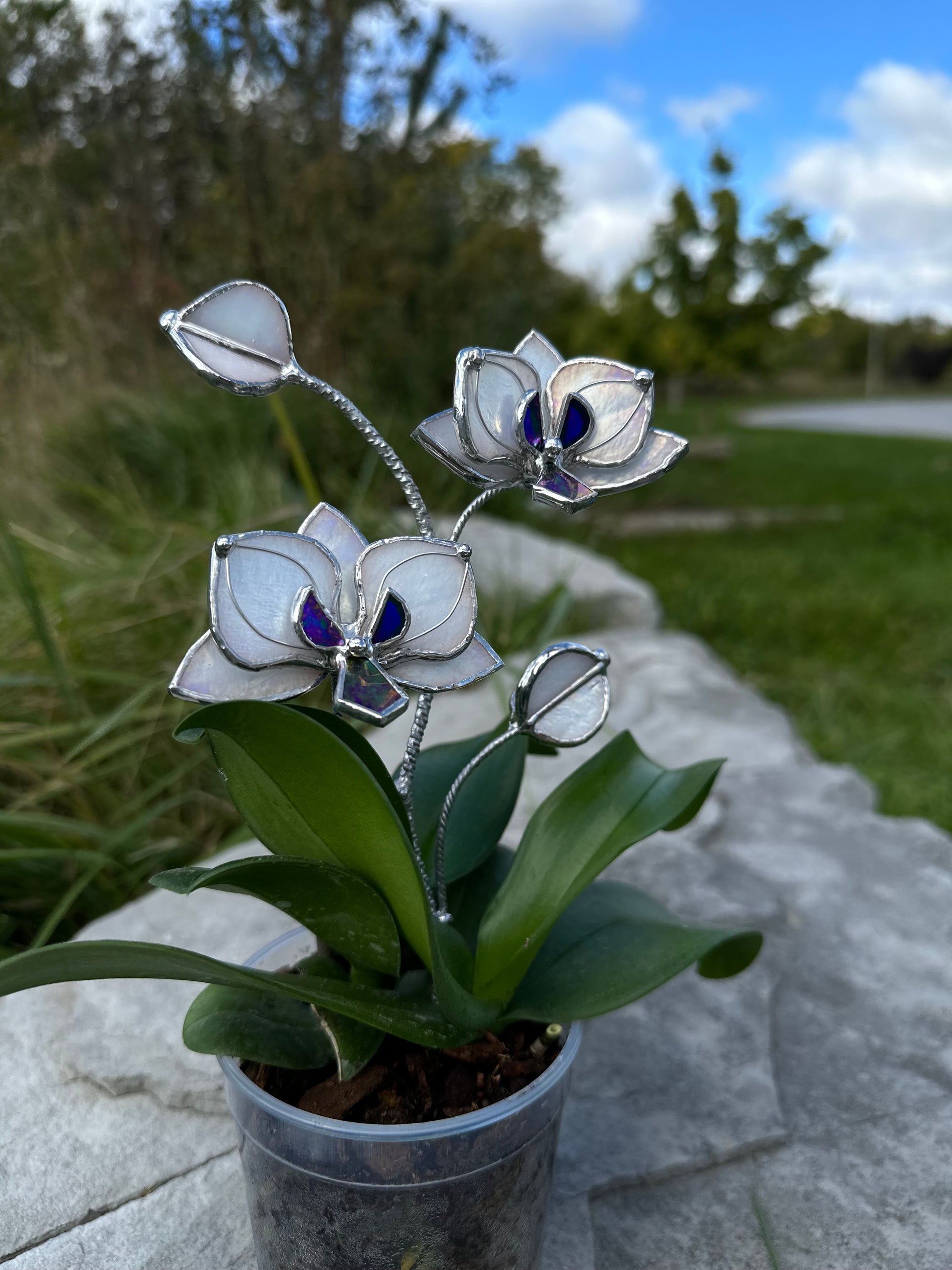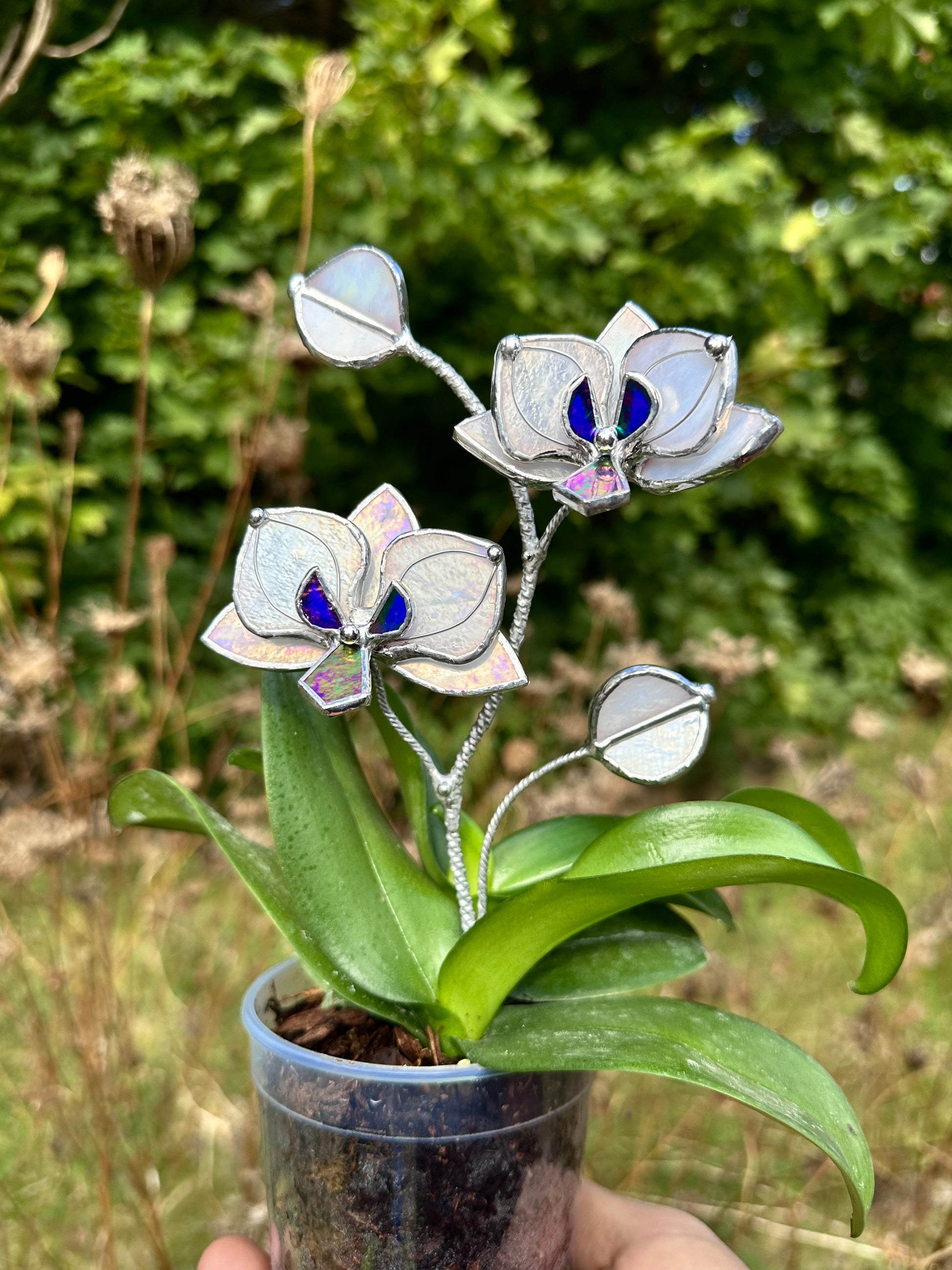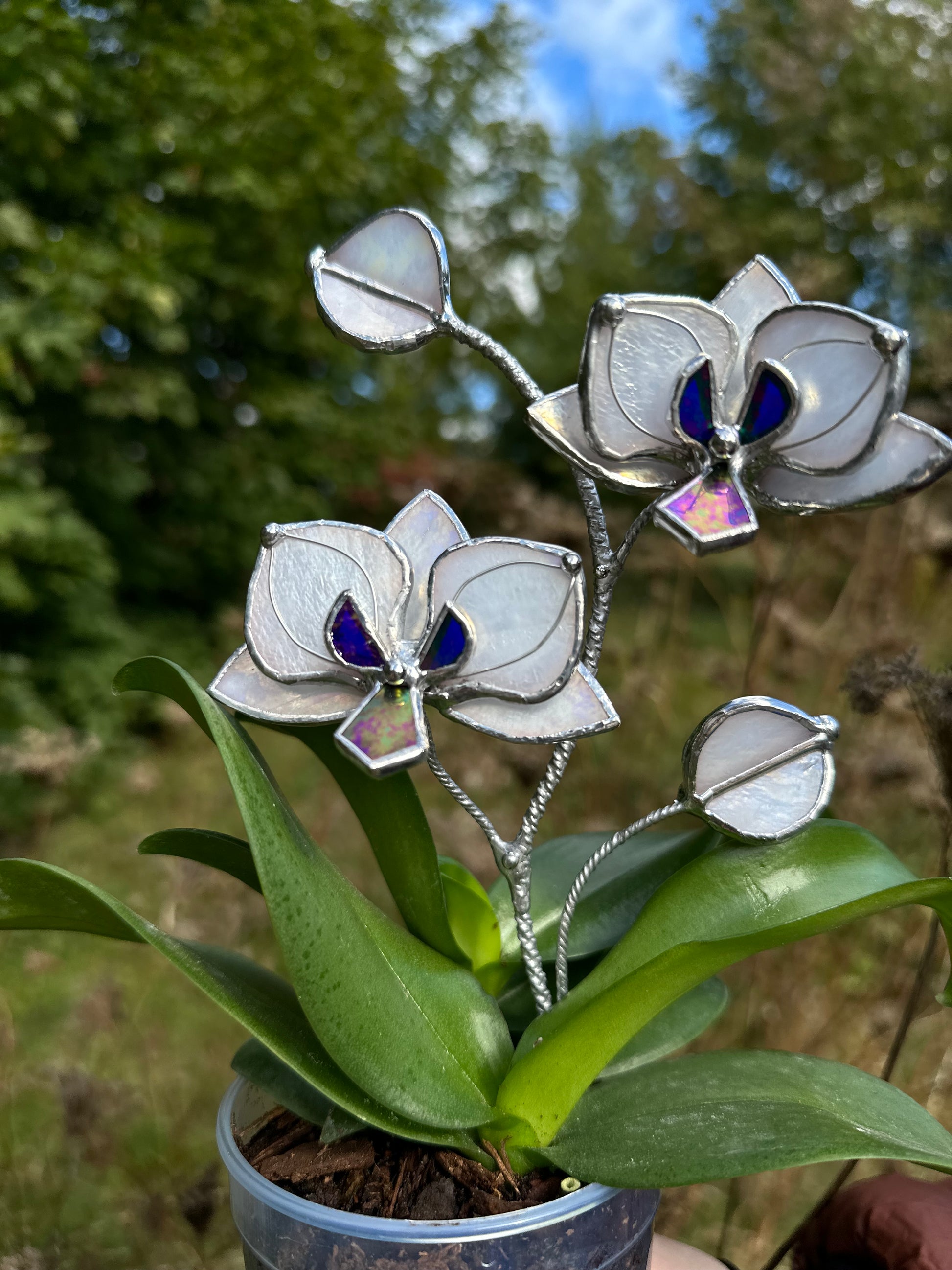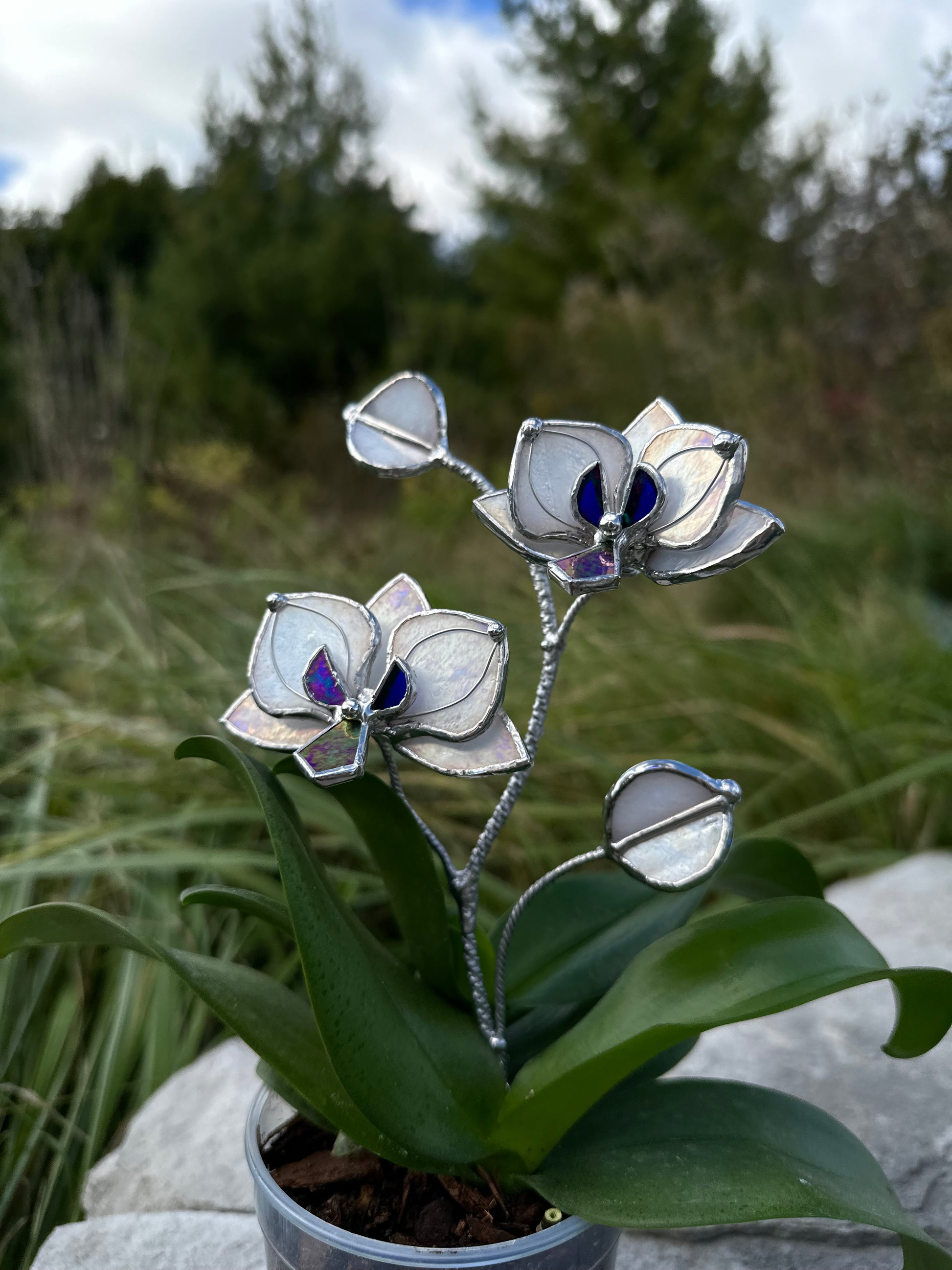 " . Orchid White pearl iridescent flower stick, Plant stake 2 flowers no pot” Stained glass tropical flower 3D, Sun catcher, Table plant, Garden stick, Outdoor and gardening decor