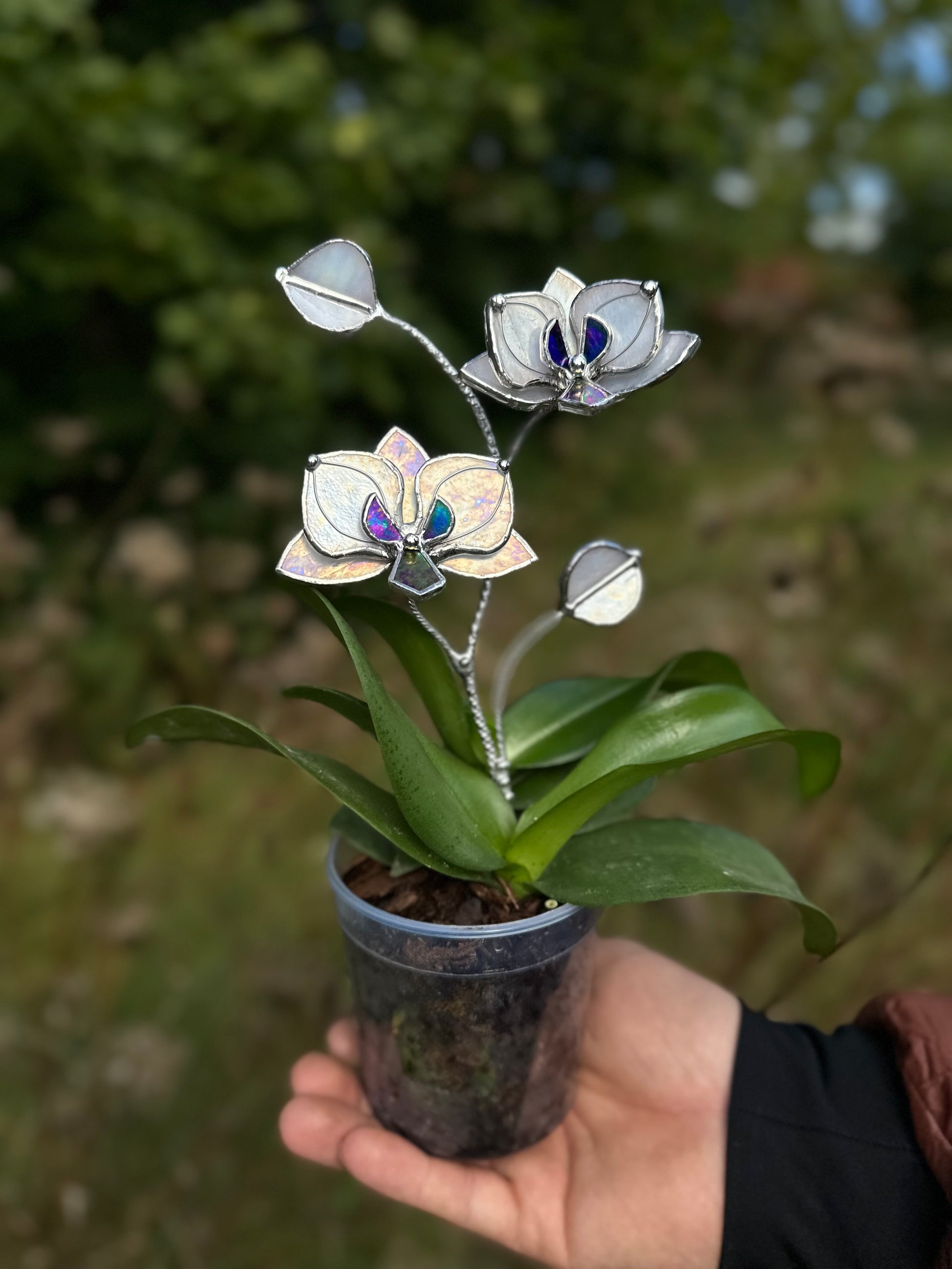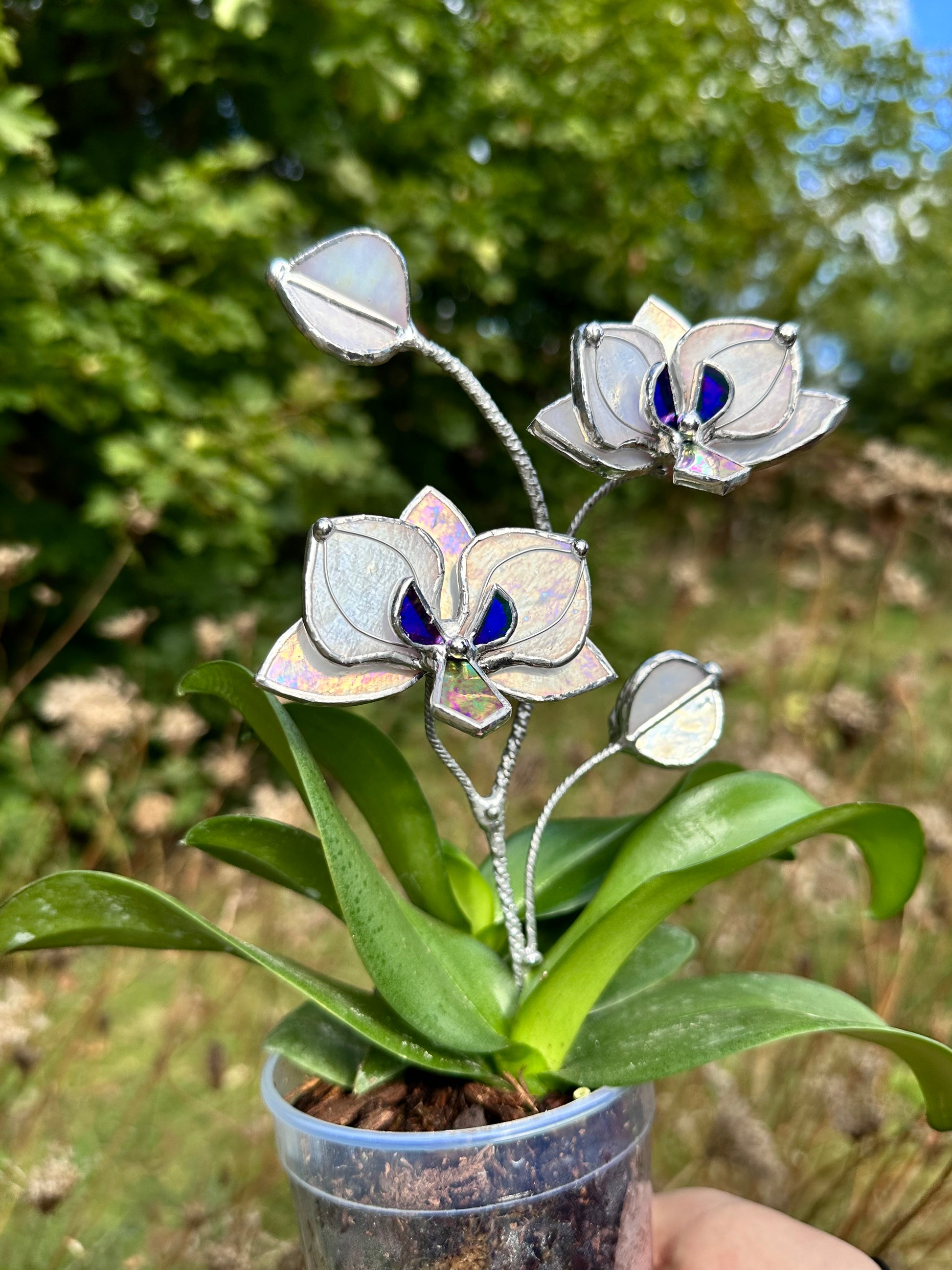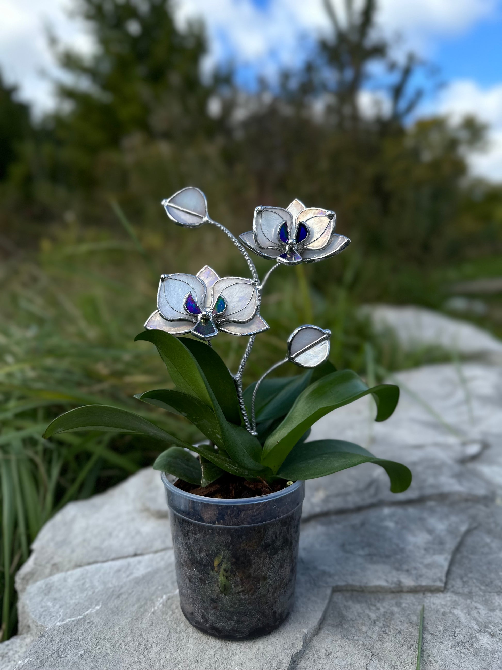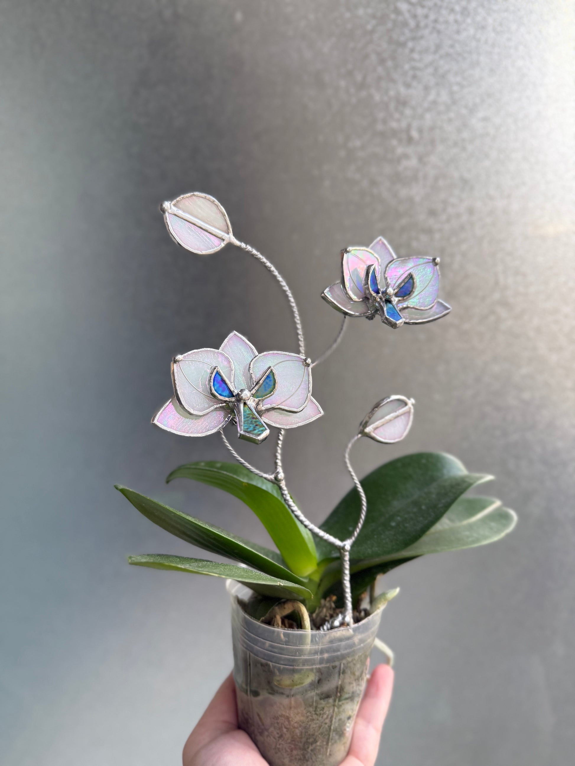 " . Orchid White pearl iridescent flower stick, Plant stake 2 flowers no pot” Stained glass tropical flower 3D, Sun catcher, Table plant, Garden stick, Outdoor and gardening decor