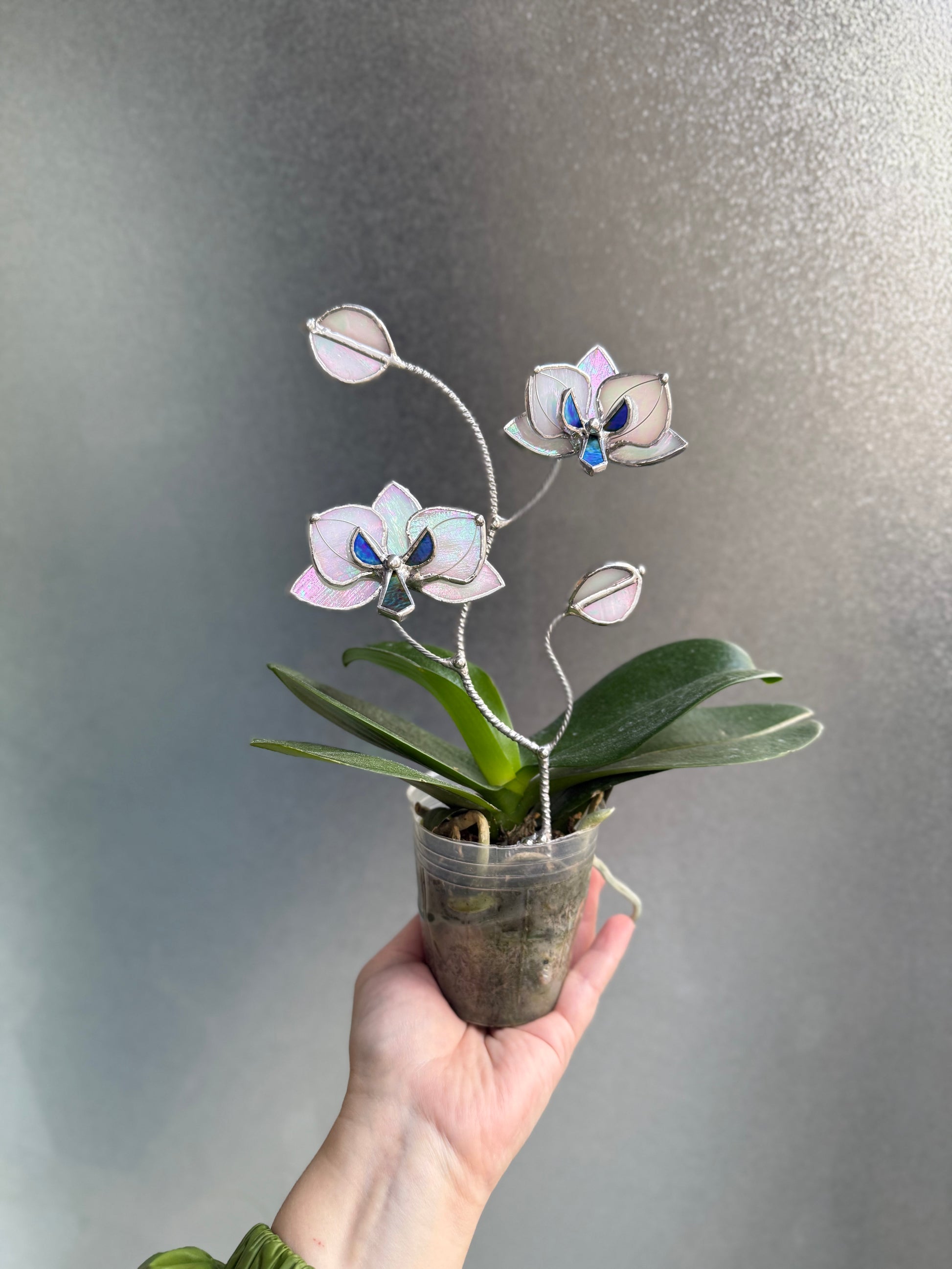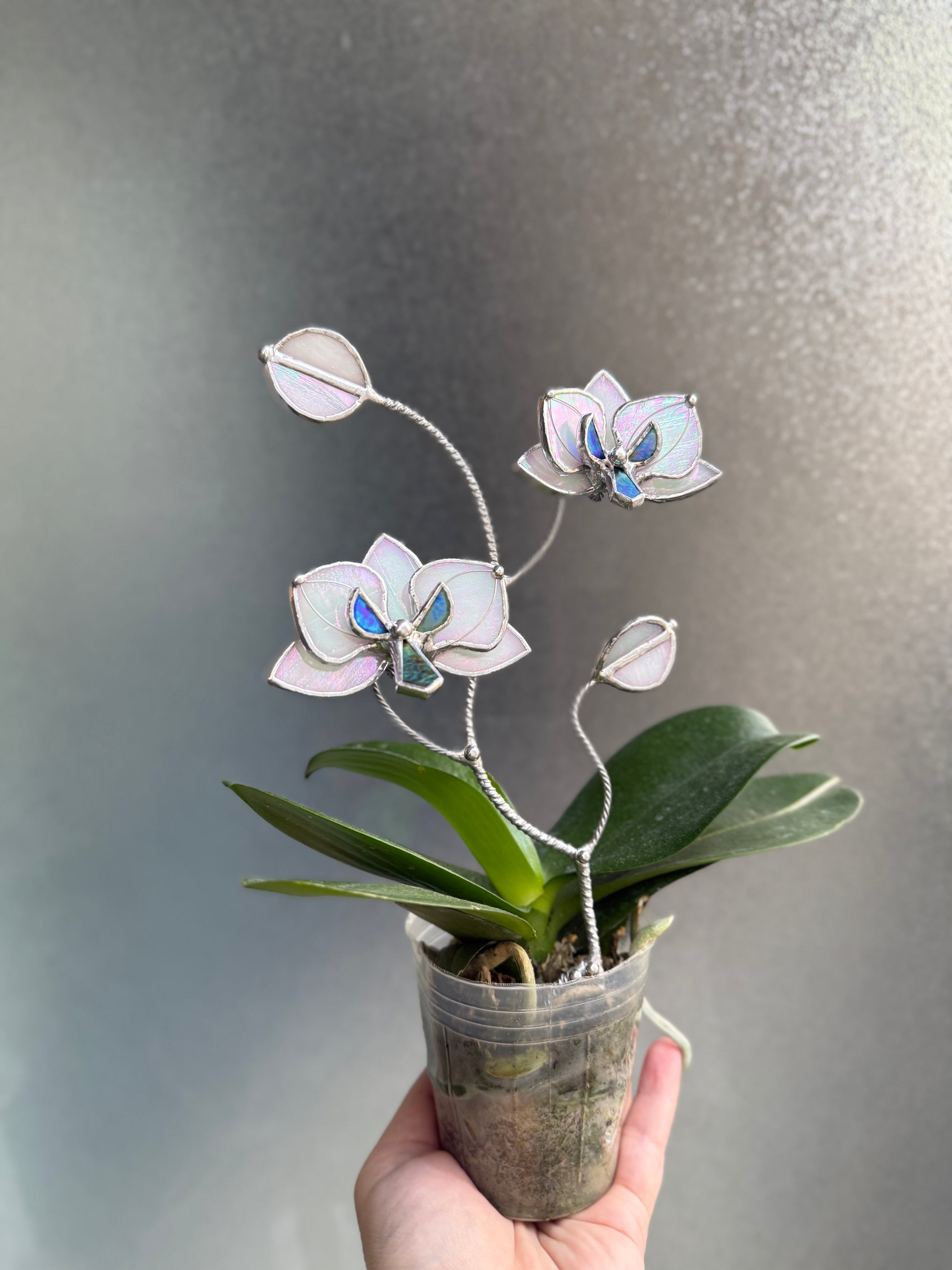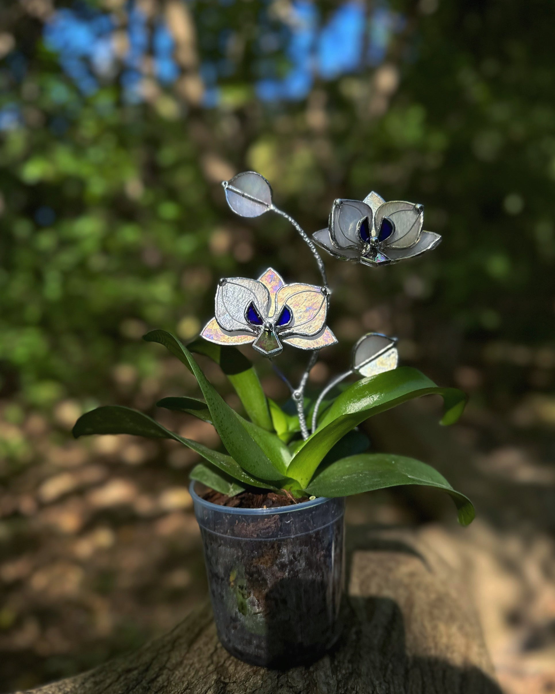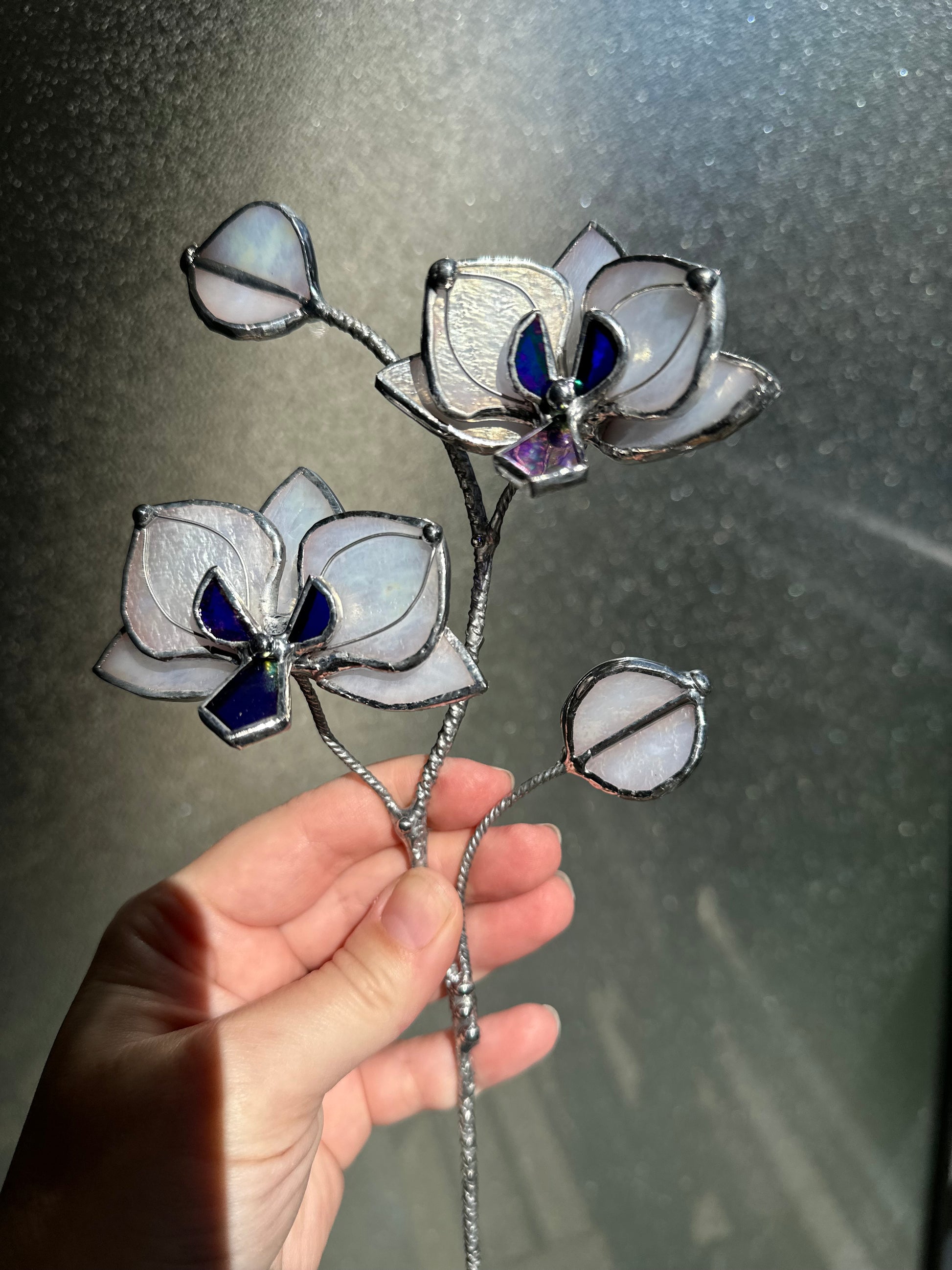 " . Orchid White pearl iridescent flower stick, Plant stake 2 flowers no pot” Stained glass tropical flower 3D, Sun catcher, Table plant, Garden stick, Outdoor and gardening decor