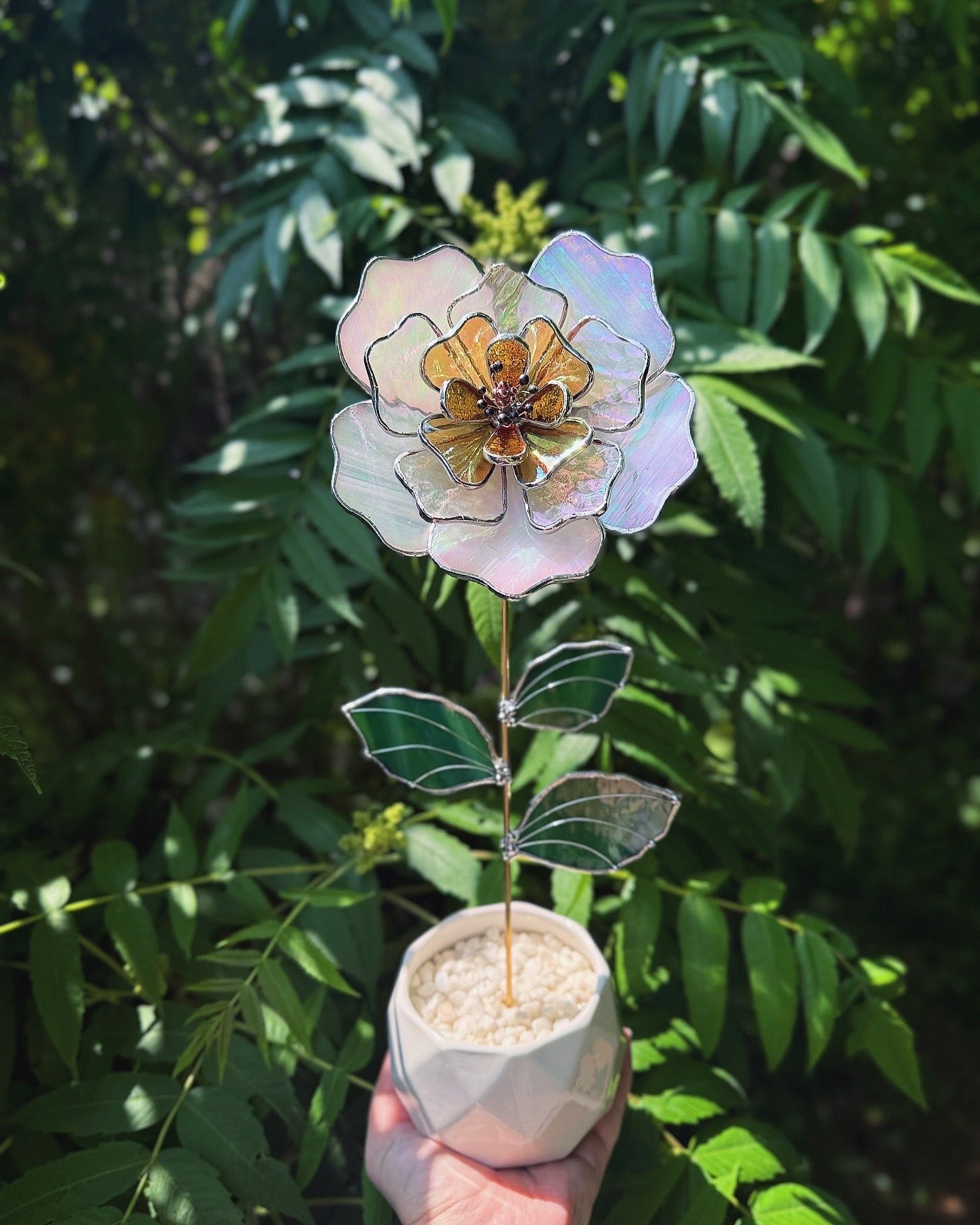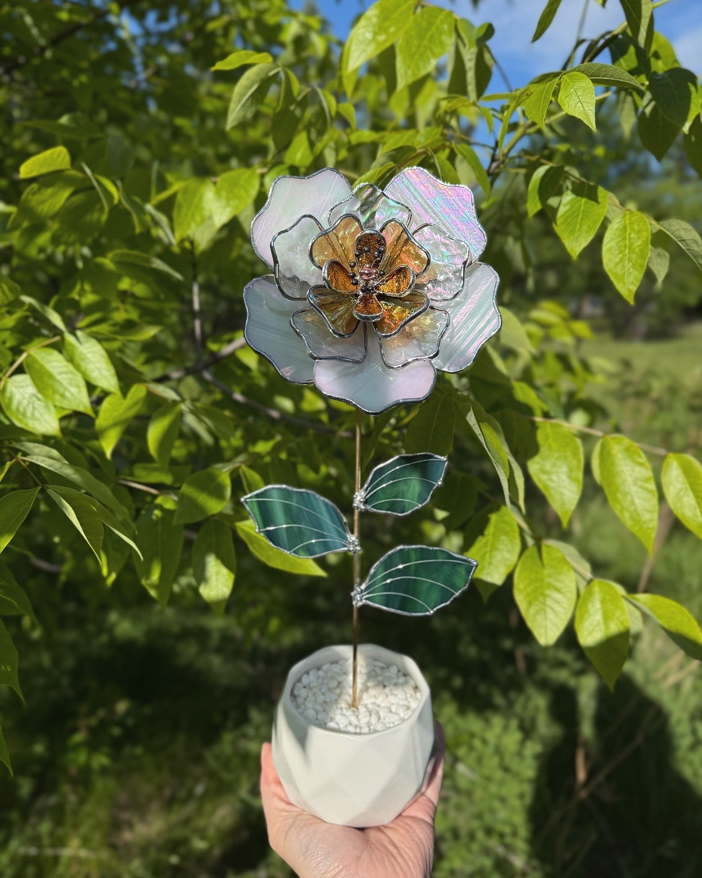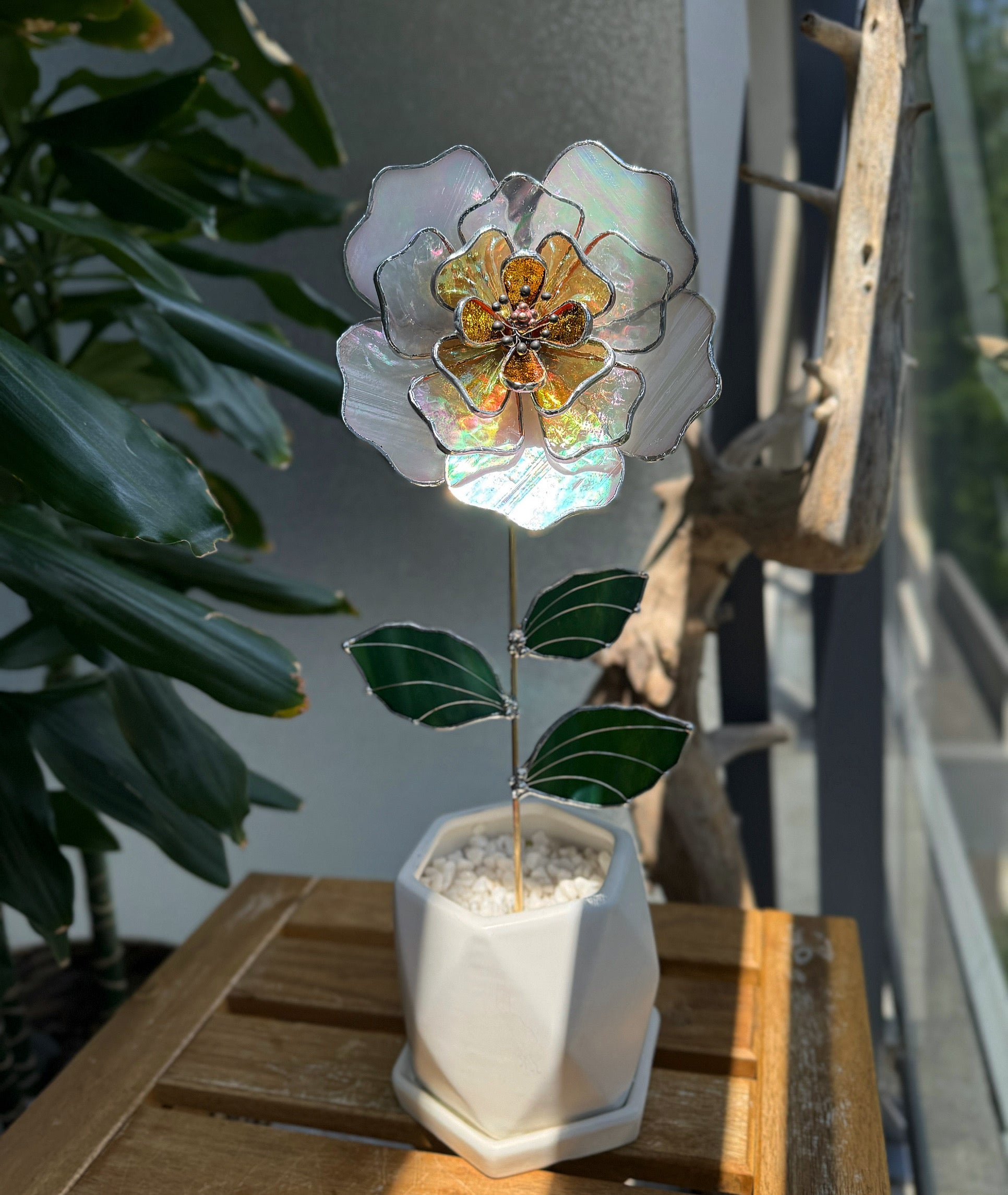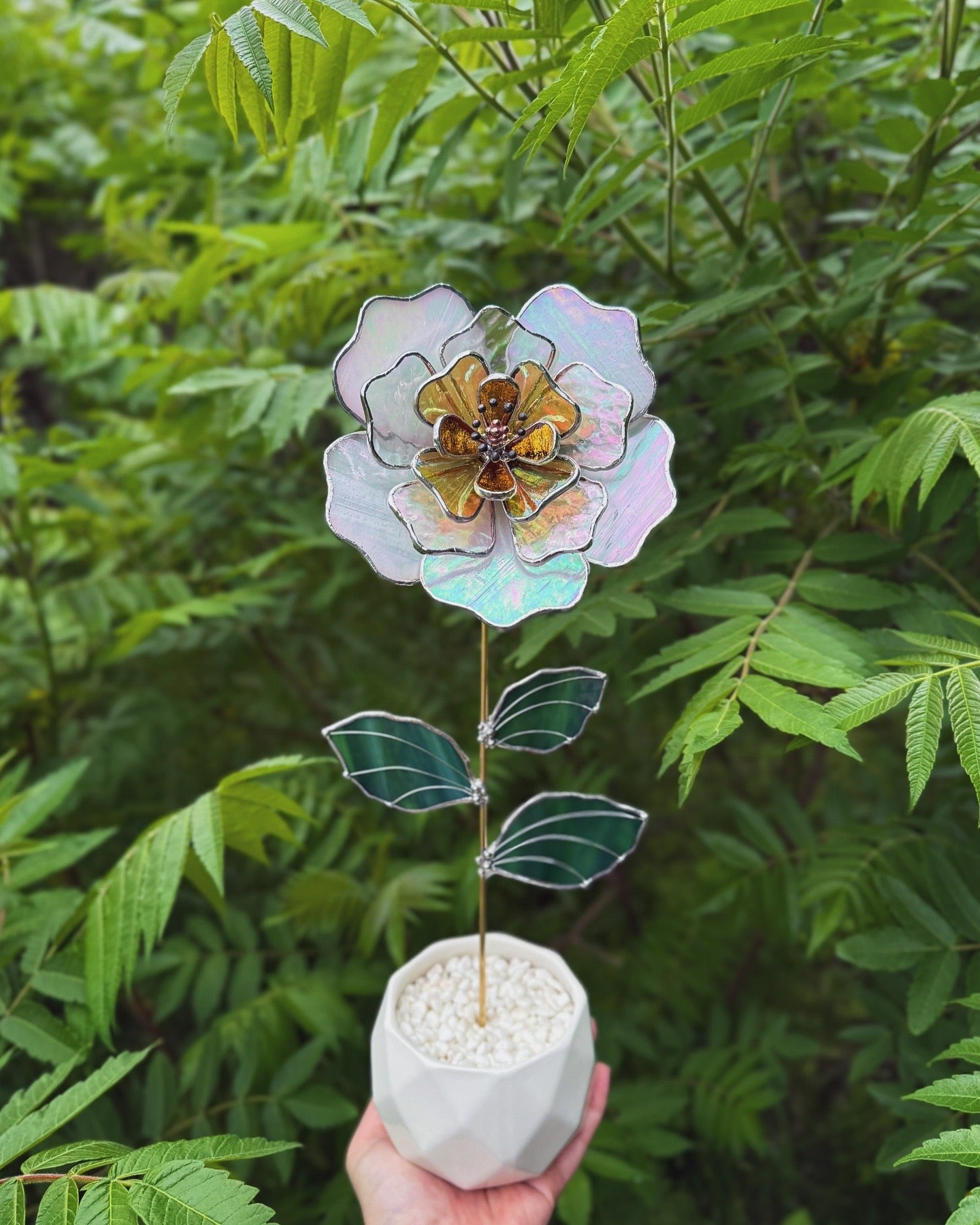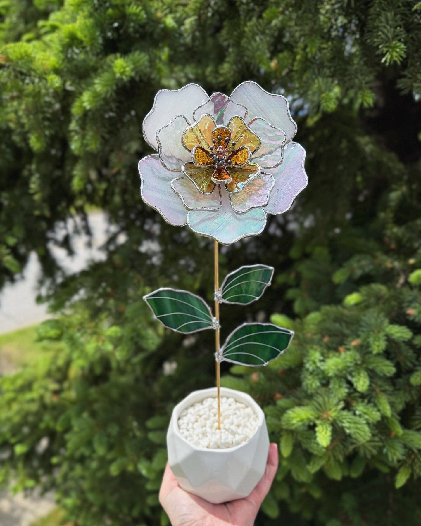 This unique hand crafted with stained glass 3D Peony Flower made of art glass. Completed with removable ceramic pot. The original design