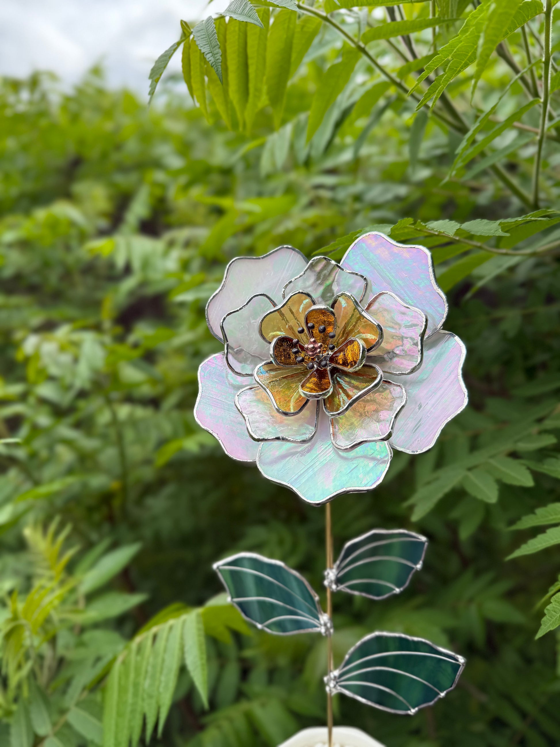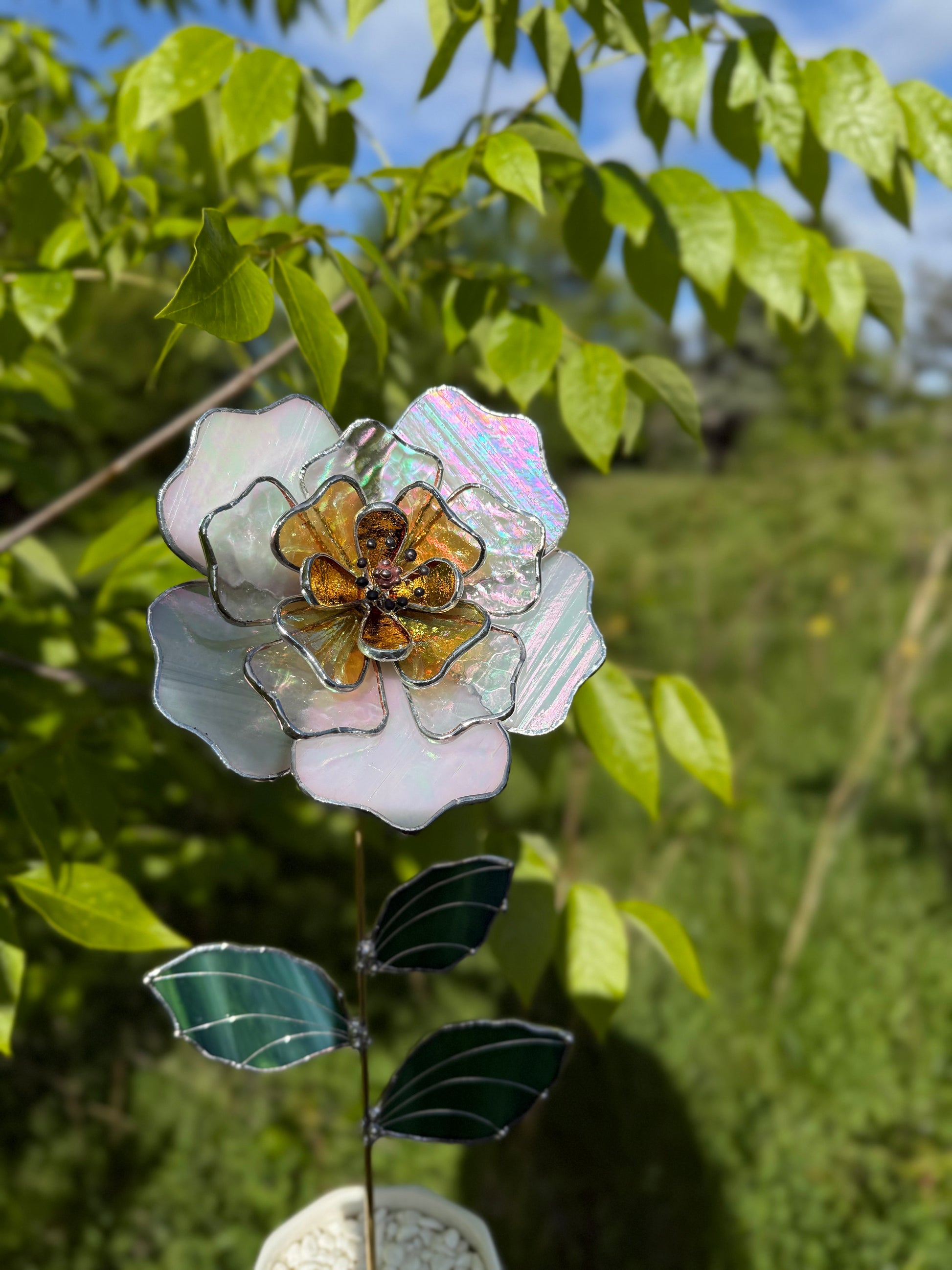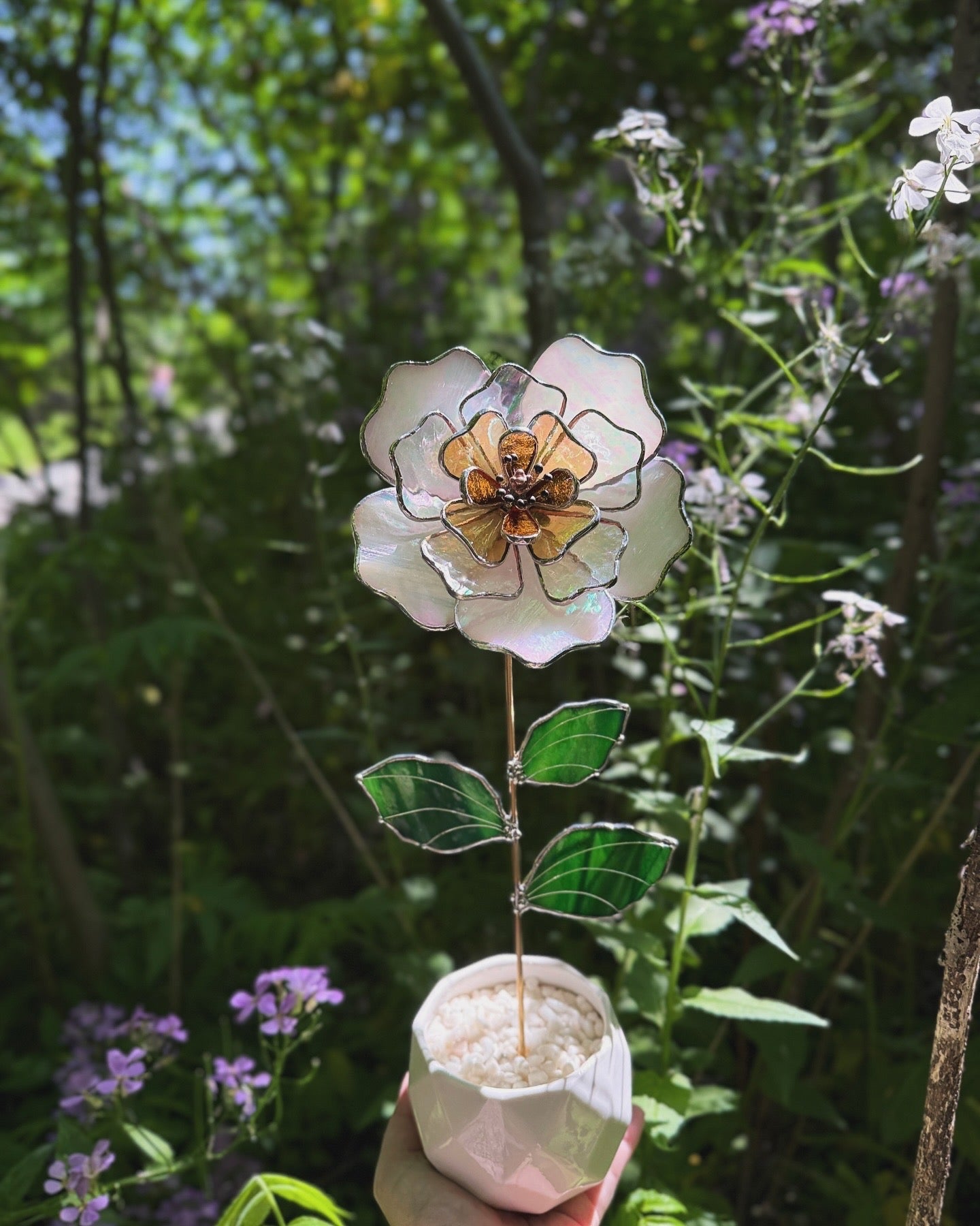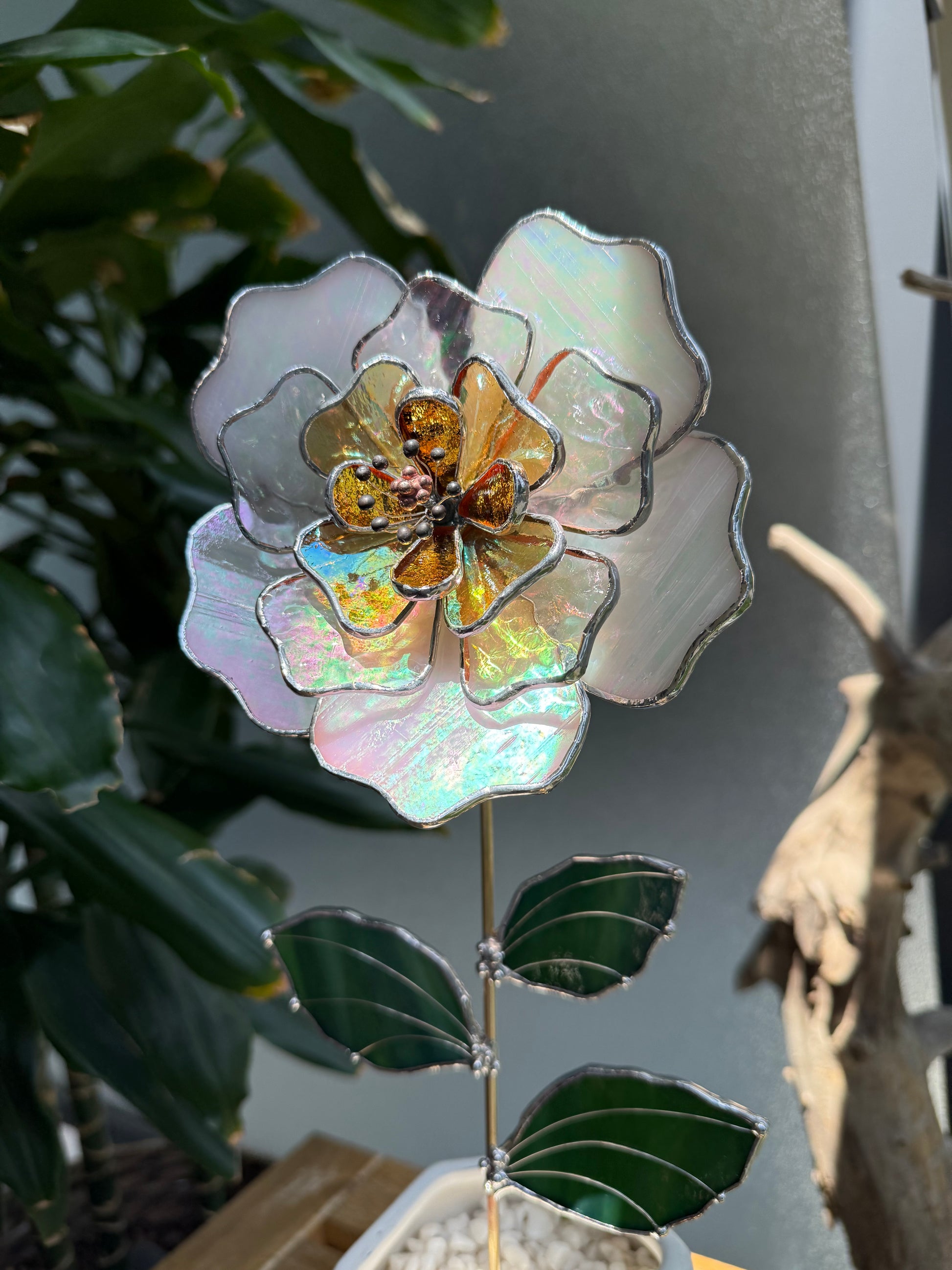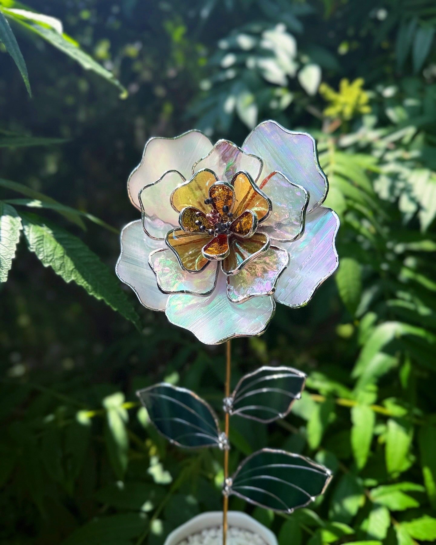 This unique hand crafted with stained glass 3D Peony Flower made of art glass. Completed with removable ceramic pot. The original design