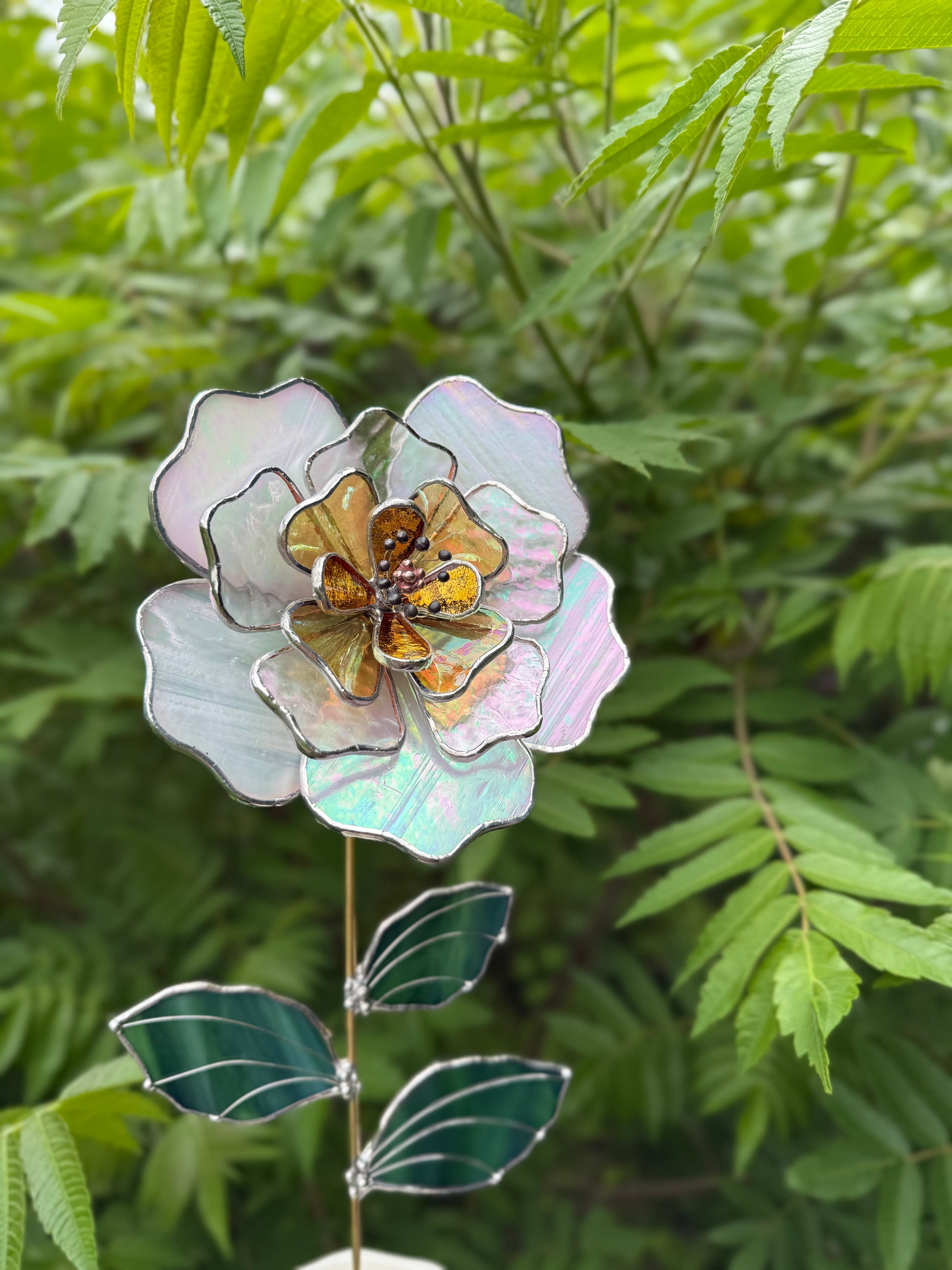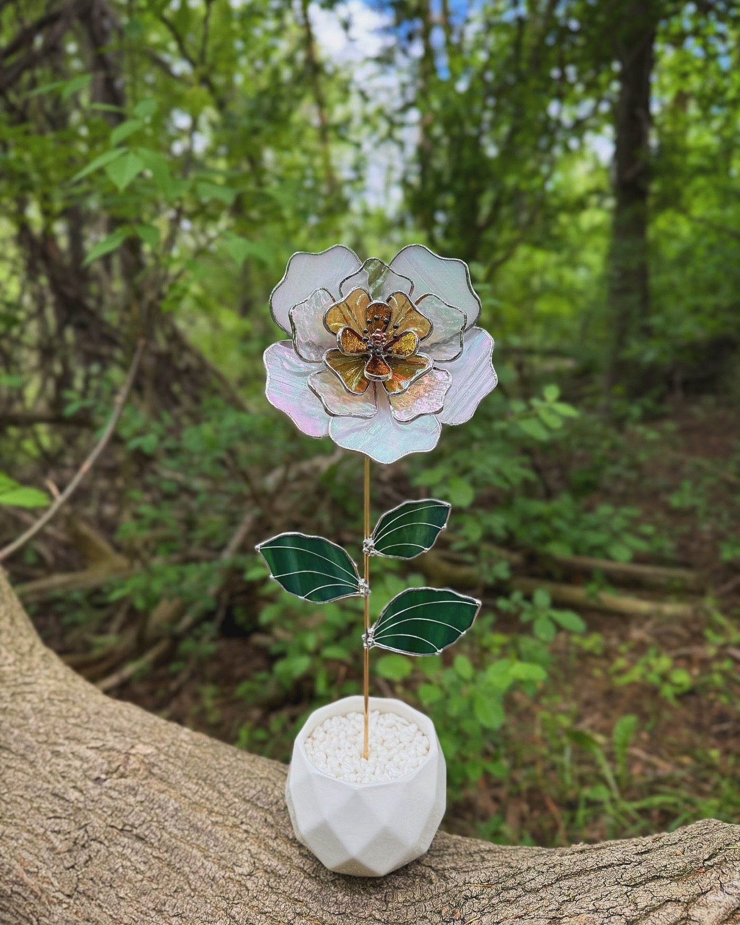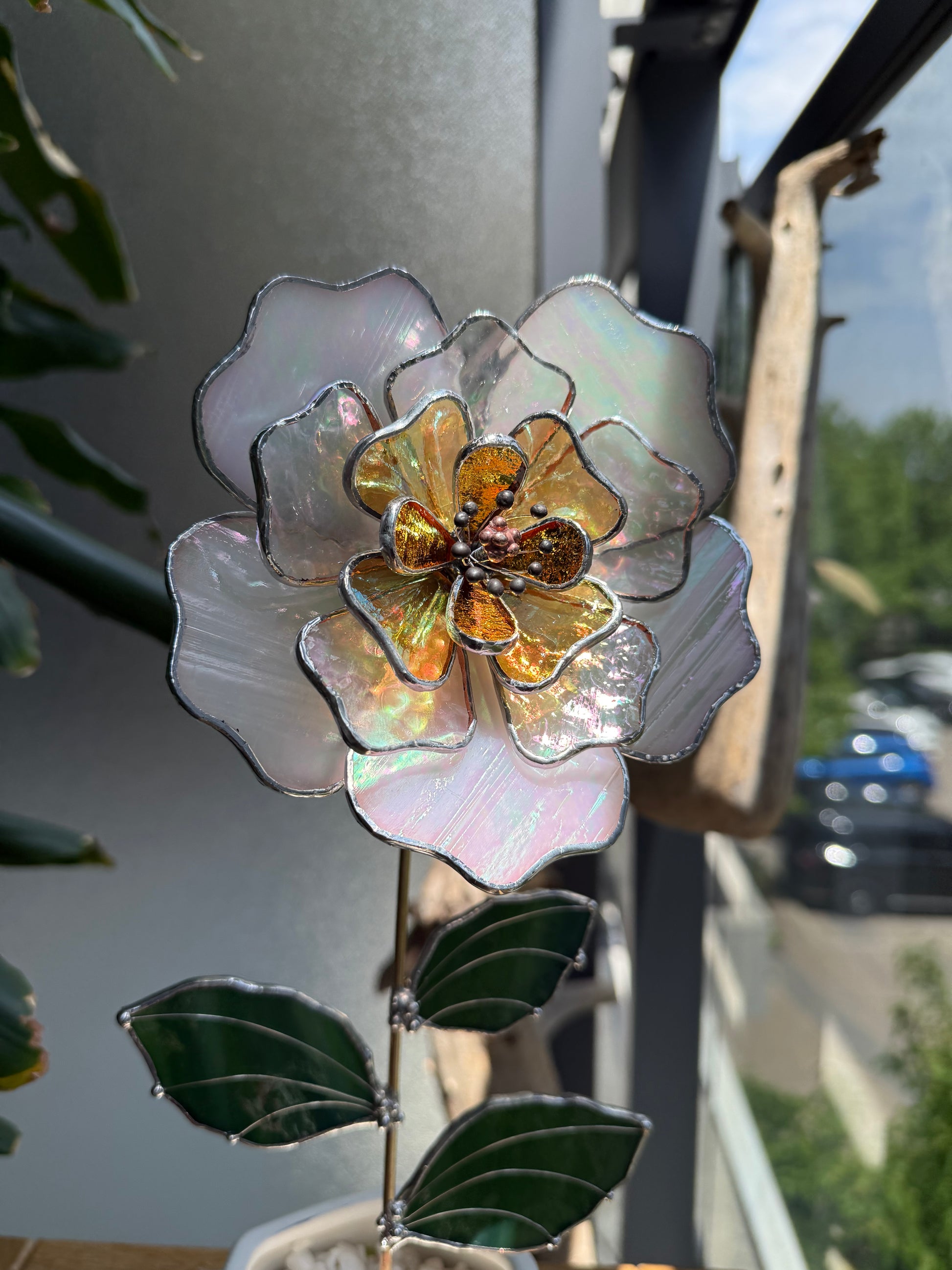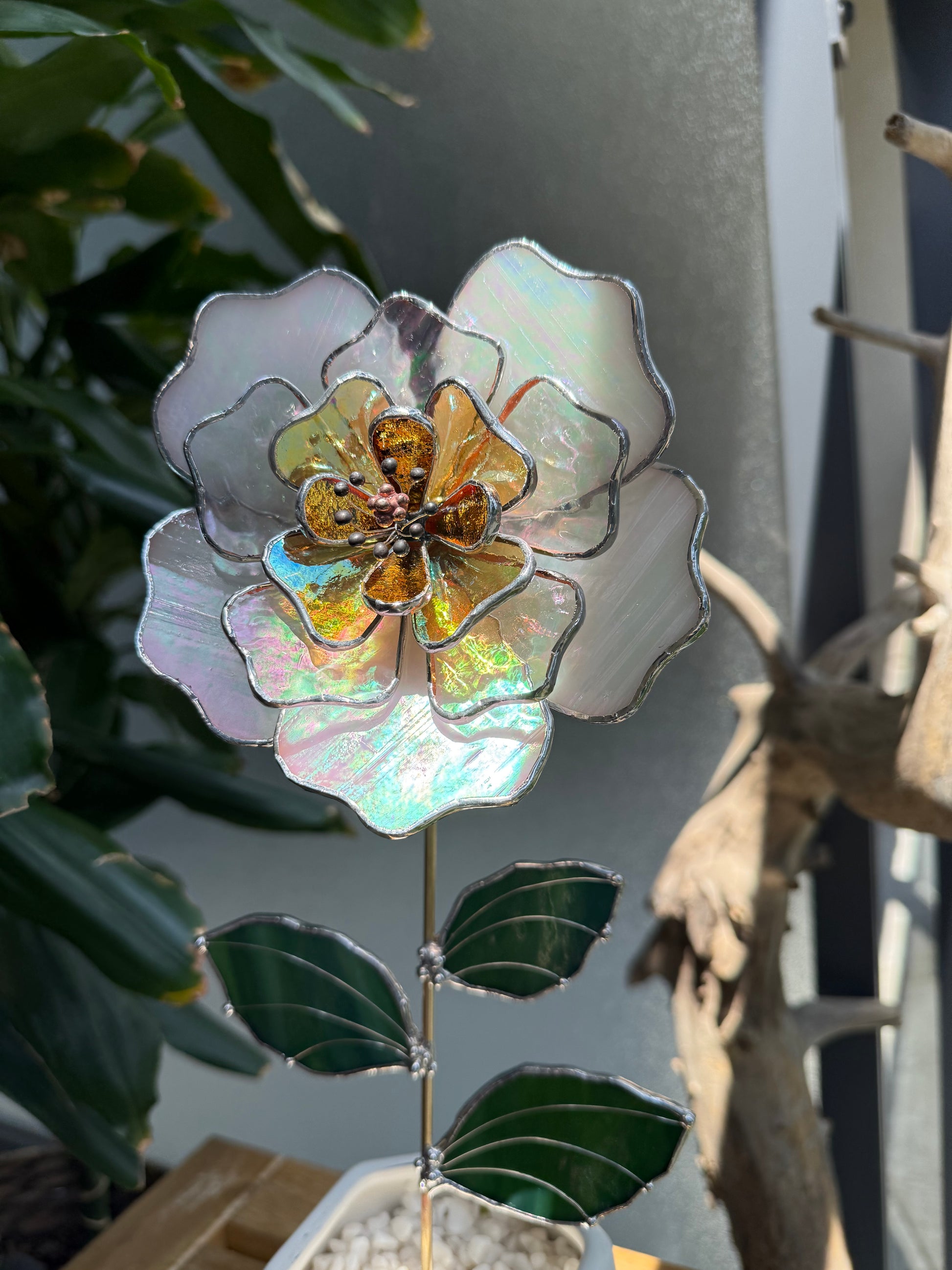 " . Beautiful Peony White & yellow iridescent Stained glass flower, tropical 3D Sun catcher, Table plant decor, wedding gift, available new sale